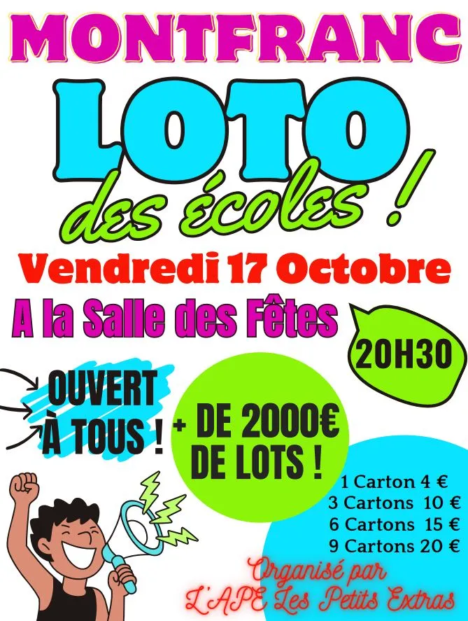 Loto organisé par l'APE Les Petits Extras à la salle des fêtes, venez tenter votre chance, de nombreux lots sont à gagner, plus de 2000 € de lots