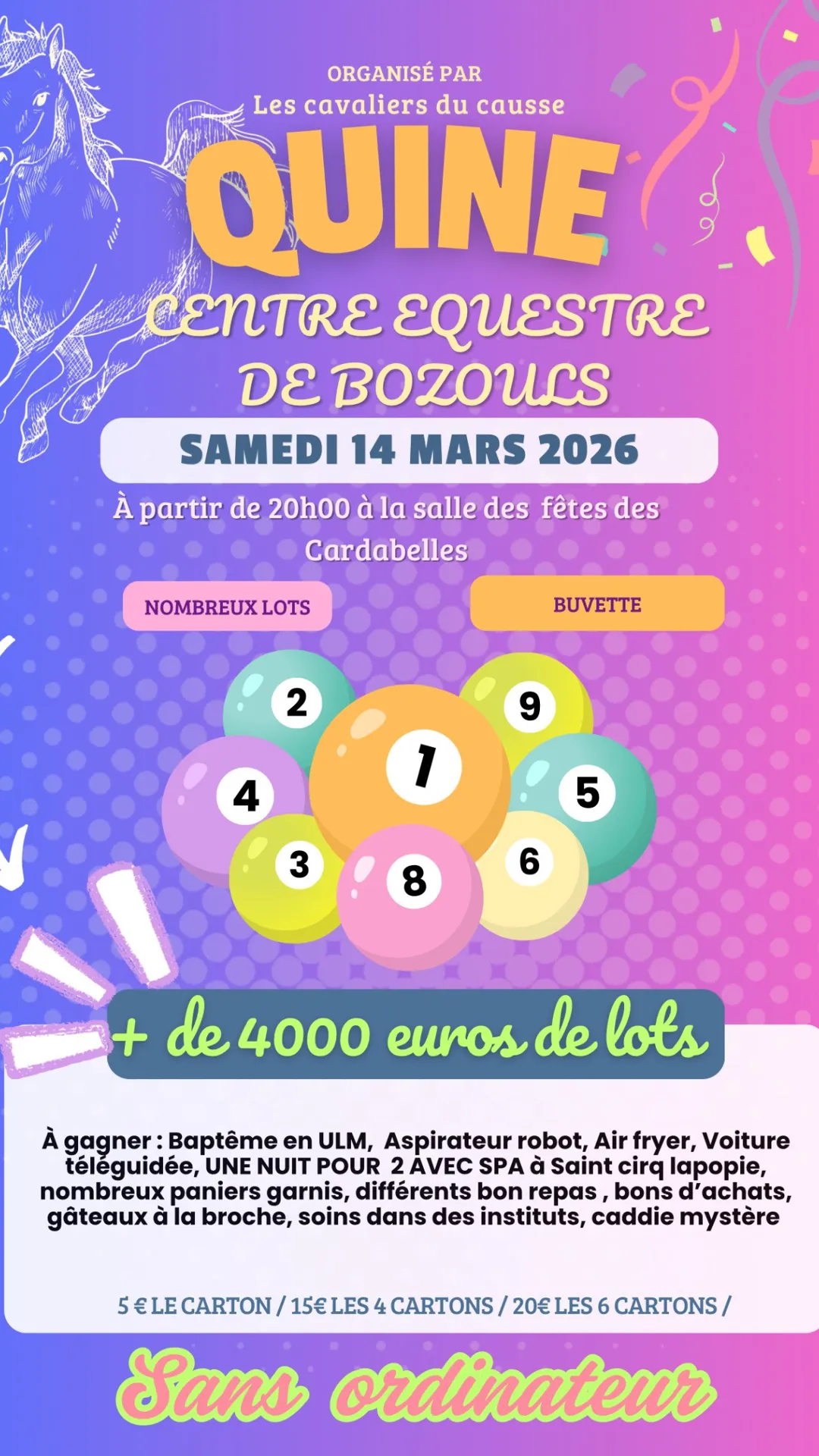 Organisé par les Cavaliers du Causse (centre équestre) - sans ordinateur - 4000 € de lots, buvette