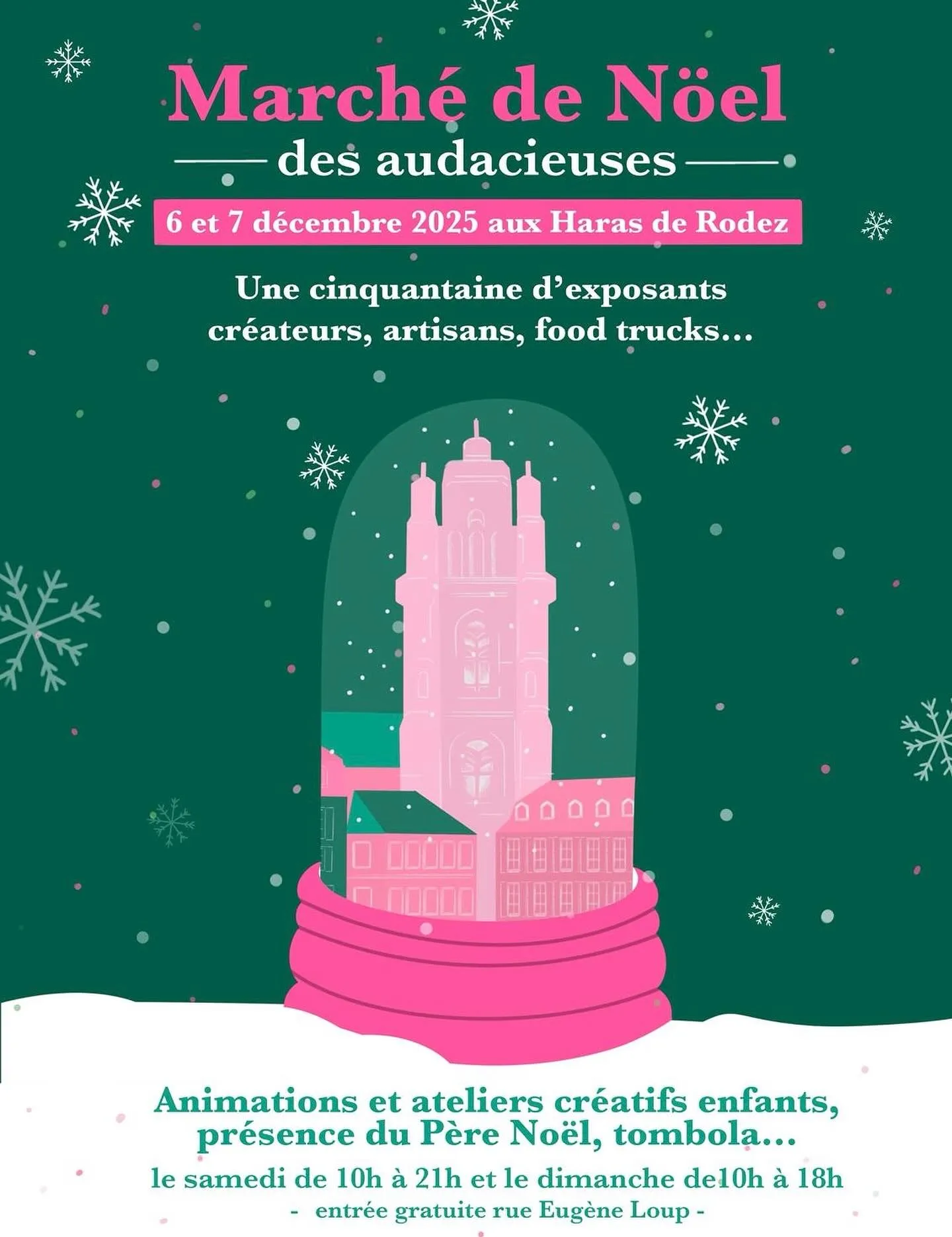 Vous pourrez sur place vous restaurer, boire un verre, gouter.Il y’aura également plusieurs animations pour les petits et grands, ateliers créatifs, maquillage… Le samedi 6 décembre de 10h à 21h (nocturne), et le dimanche 7 décembre de 10h à 18h.Au haras de Rodez, entrée rue Eugène Loup.Entrée gratuite Les exposants seront en intérieur. Food truck en extérieur.La team DES AUDACIEUSES vous attend nombreux et nombreuses pour ce week-end, hâte de vous retrouver.