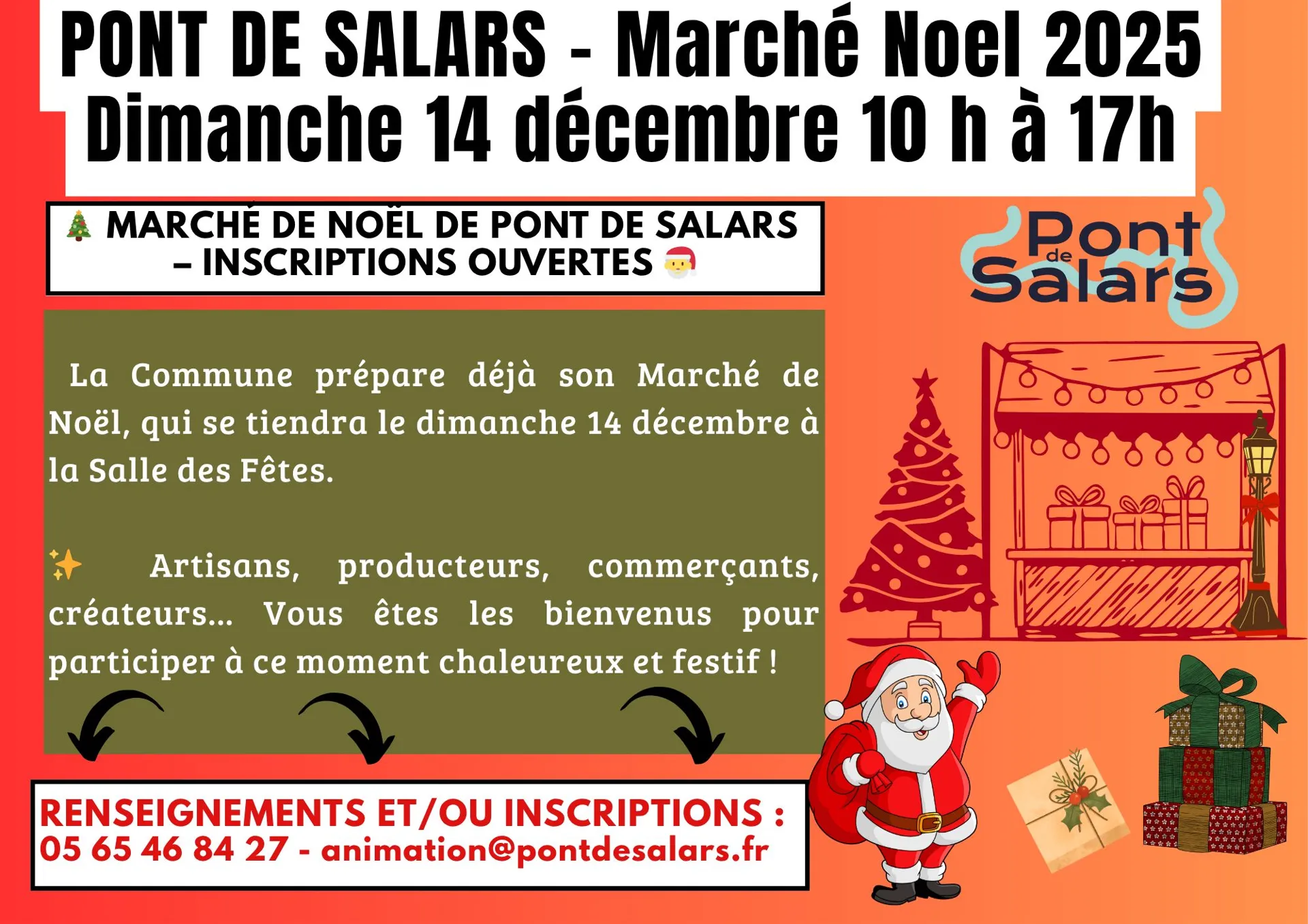 10h à 17h - Salle des fêtes. Les inscriptions sont ouvertes. Artisans, producteurs, commerçants, créateurs, vous êtes mes bienvenus pour participer à ce moment chaleureux ! Infos et/ou inscriptions au 05 65 46 84 27 ou animation@pontdesalars.fr.
