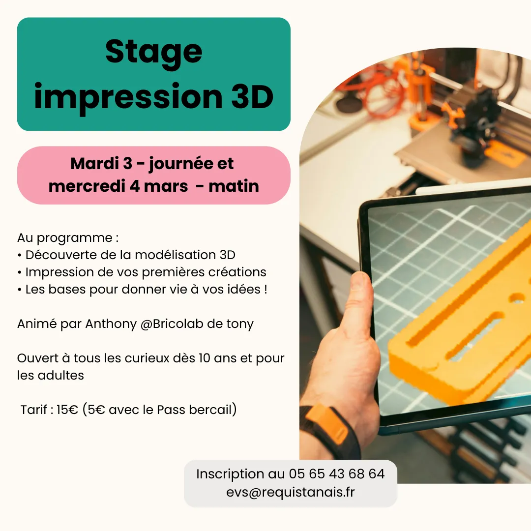 Tarif : 15€ (5€ avec le Pass bercail) Au Bercail - Inscription au 05 65 43 68 64 ou evs@requistanais.fr Rejoignez-nous pour expérimenter, apprendre et bidouiller ensemble !