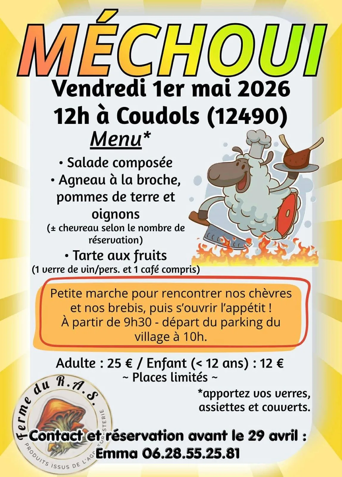12h, un repas Méchoui est servi incluant salade composée, agneau à la broche (ou chevreau selon les réservations) avec pommes de terre et oignons, suivi d'une tarte aux fruits.