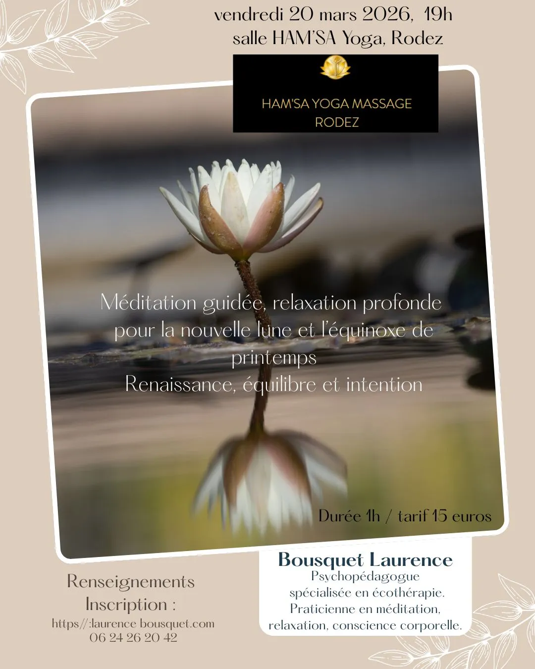 19h - Salle Ham'sa Yoga à Rodez. Pour la nouvelle lune et l'équinoxe de Printemps. Renaissance, équilibre et intention. Durée 1h, tarif 15€. Infos et inscription auprès de Laurence Bousquet au 06 24 26 20 42.