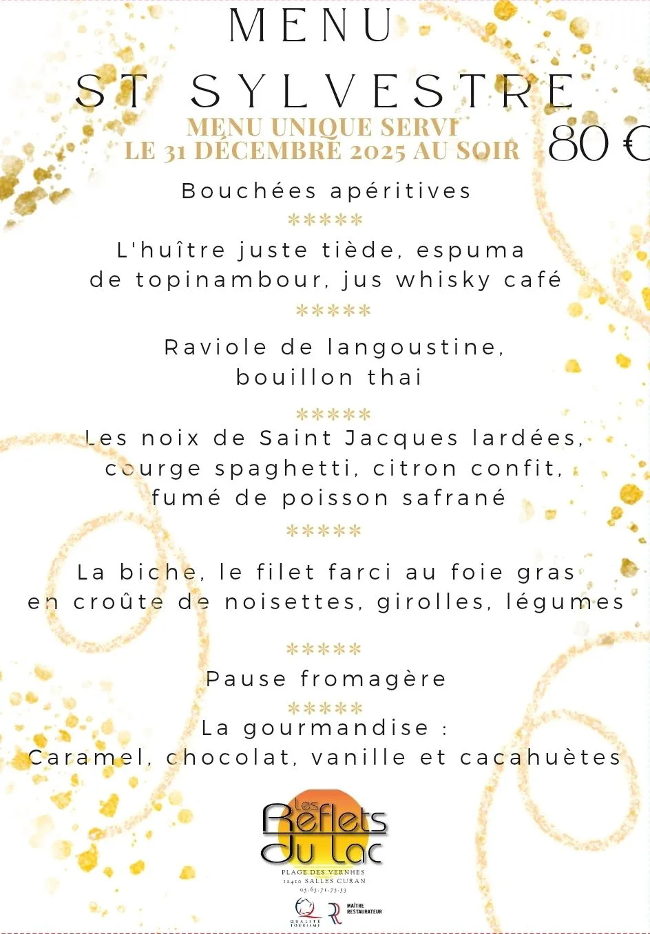 19h - Restaurant les Reflets du Lac, plage des Vernhes. Menu servi pour le Réveillon de la Saint Sylvestre. 80€ sur réservation au 05 65 71 75 53.