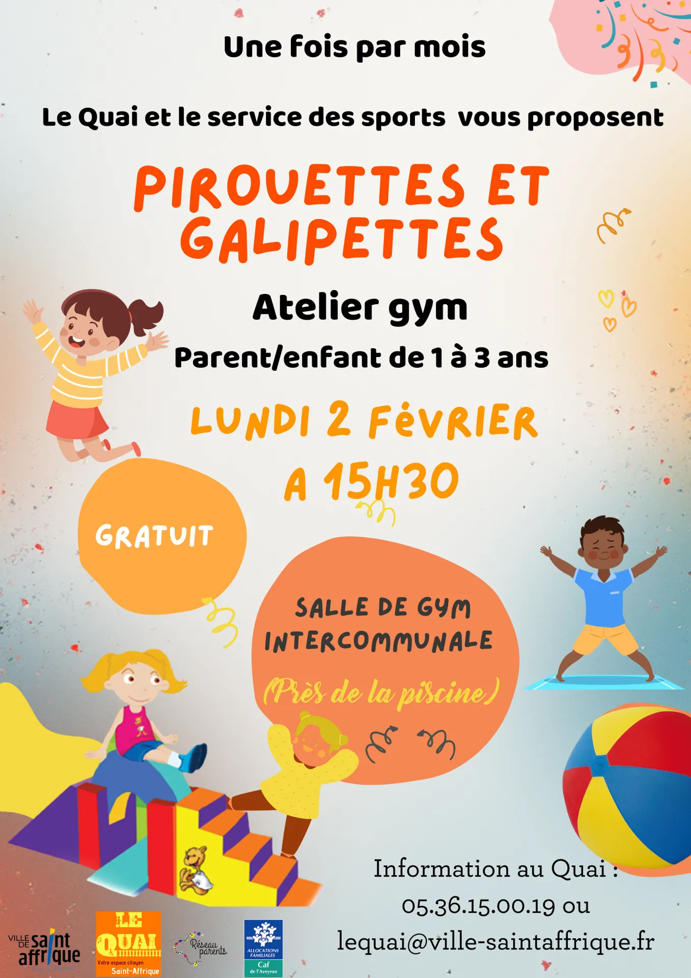 Le Quai et le service des sports vous proposent un atelier Gym pour les 1-3 ans et leurs parents : jeux, motricité et goûter à la salle de gym !
