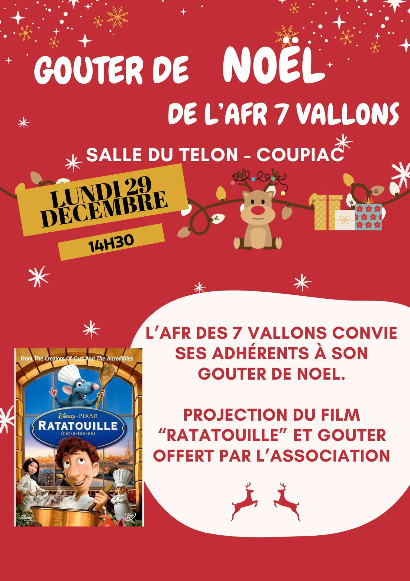 L'association Familles Rurales des 7 vallons est heureuse de vous inviter à son goûter de Noël. Au programme, projection du film "Ratatouille" et partage du gouter offert par l'association.