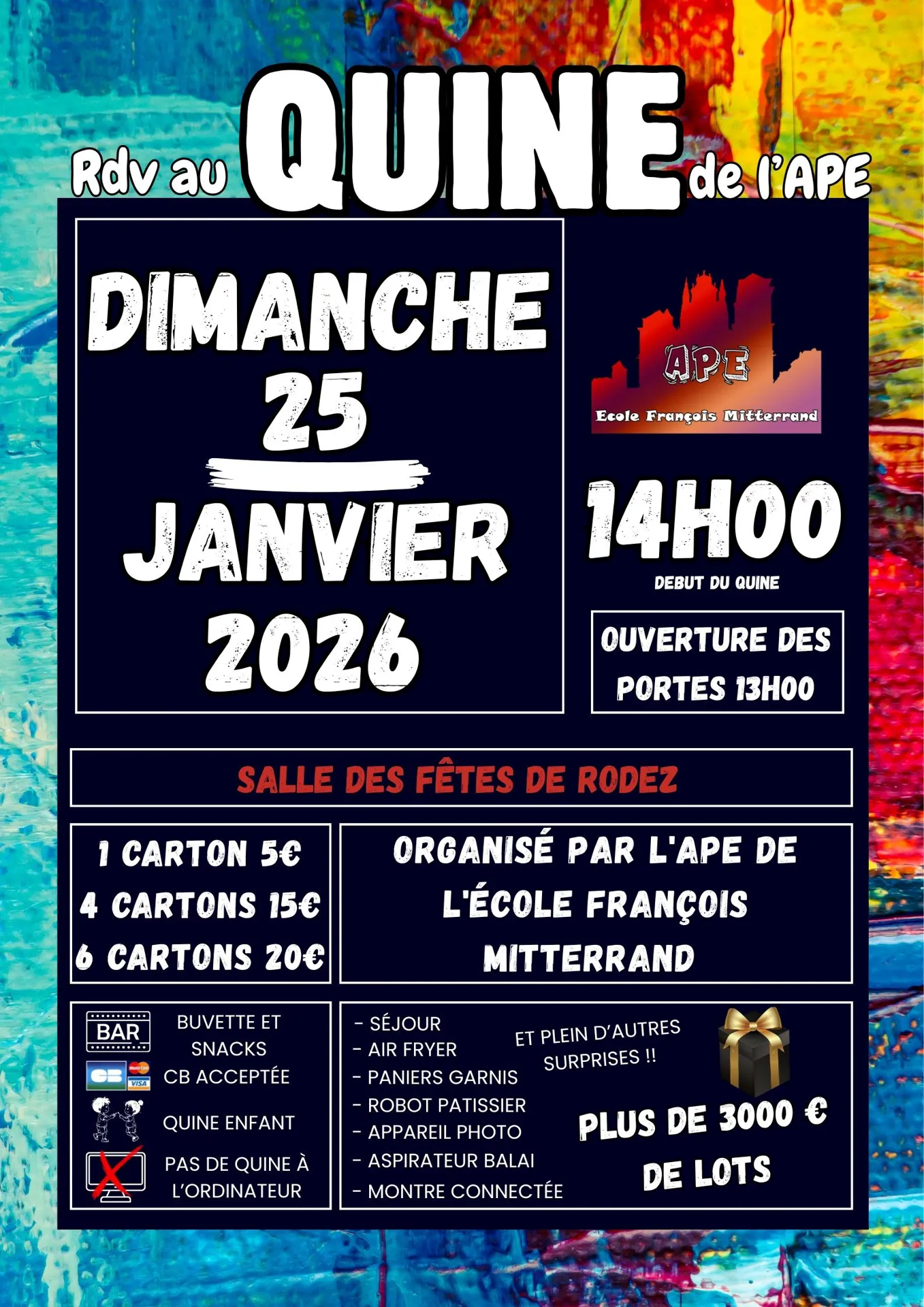 Quine organisé par l’APE de l’école François Mitterrand le dimanche 25 janvier à 14 heures avec 20 parties, + un super quine, un quine des enfants (gratuit) et un quine du perdant. Nombreux lots offerts par les commerçants et sites touristiques du grand Rodez, mais également : un séjour, des paniers garnis, des équipements électroménagers (air fryer, robot pâtissier, aspirateur balai…), multimédias (appareil photo, montre connectée) et beaucoup de surprises.