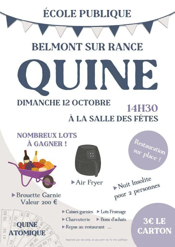 Quine organisé par l'APE de l'école publique de Belmont, venez tenter votre chance et remporter les nombreux lots mis en jeux: brouette garnie d'une valeur de 200€, air fryer, nuit insolite pour 2 personnes, bons d'achats...
