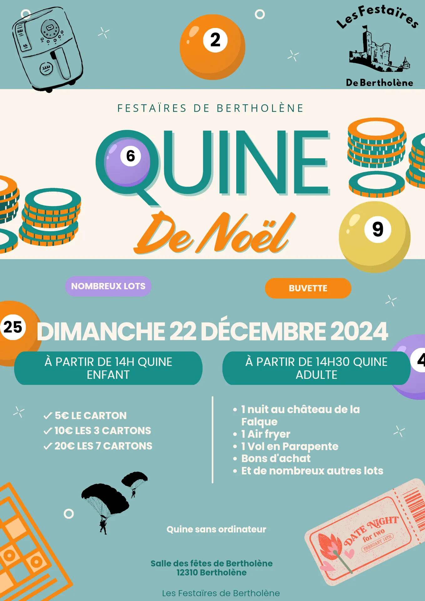 Rendez-vous le dimanche 21 décembre à 13h30 à la salle des Fêtes de Bertholène. A partir de 13h30, quine des enfants puis quine des adultes à partir de 14h30. Quine sans ordinateur.