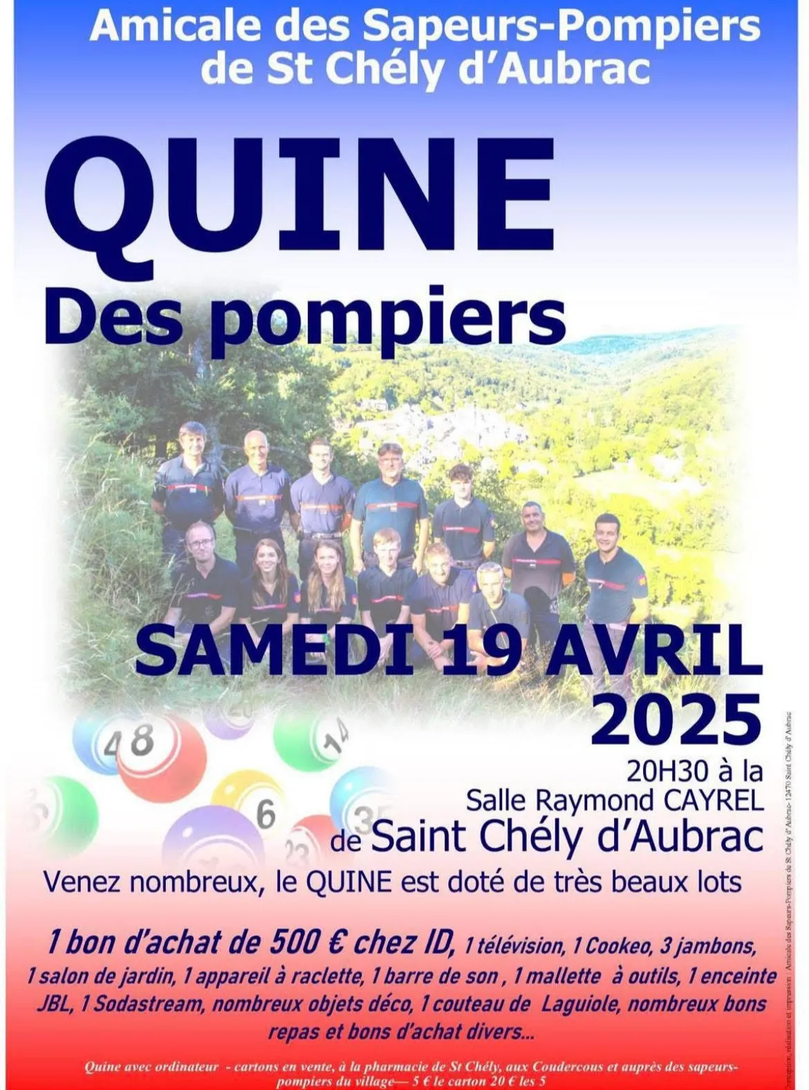 Quine des pompiersSalle des fêtes12470 Saint-Chély-d'Aubrac lat. 44.5911 - lon. 2.92444 Obtenir l'itinéraire