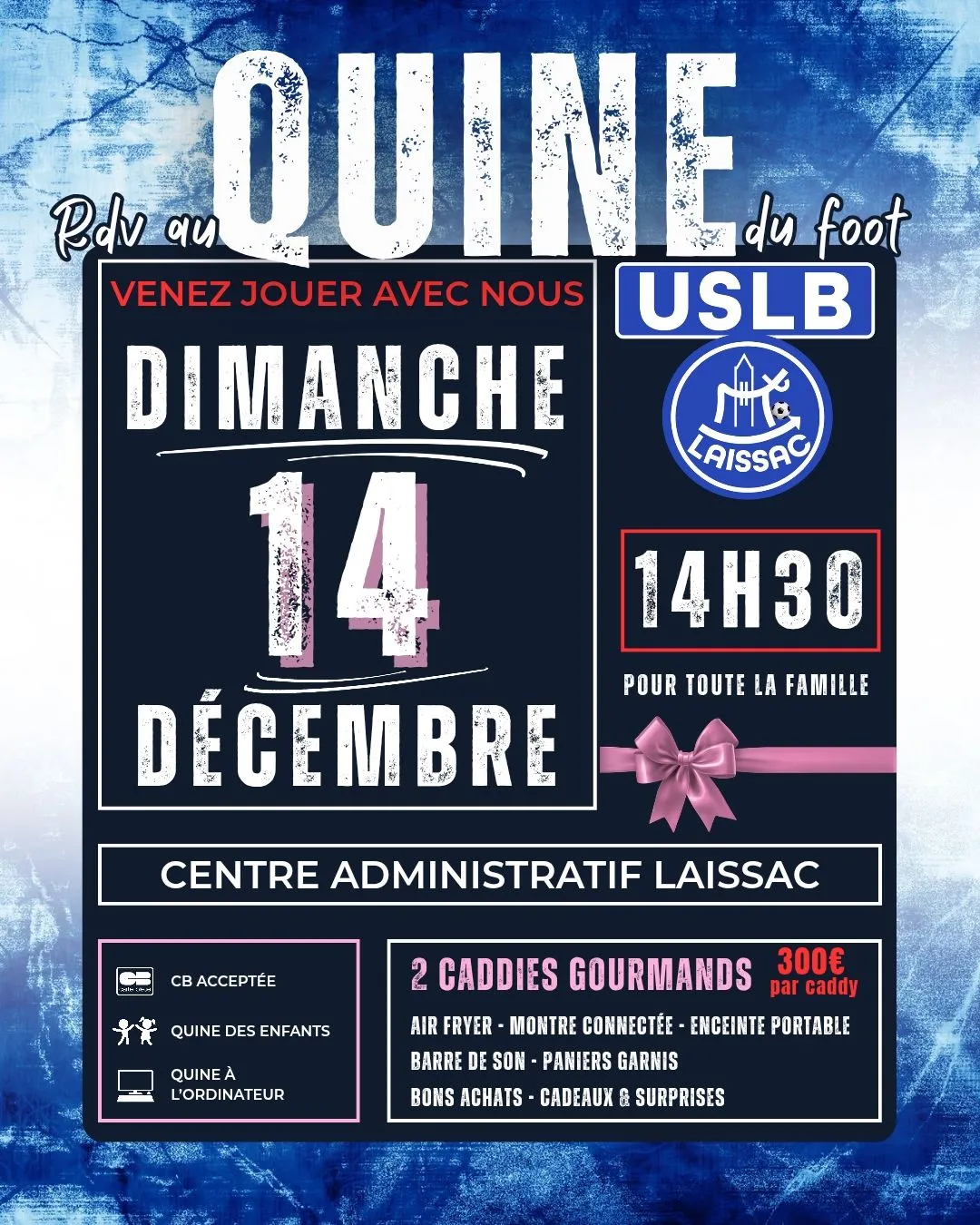 Alors non ce n'est pas encore Noël mais bel et bien le quine annuel de l’USLB. DIMANCHE 14 DECEMBRE à 14H30 au CENTRE ADMINISTRATIF de LAISSAC
