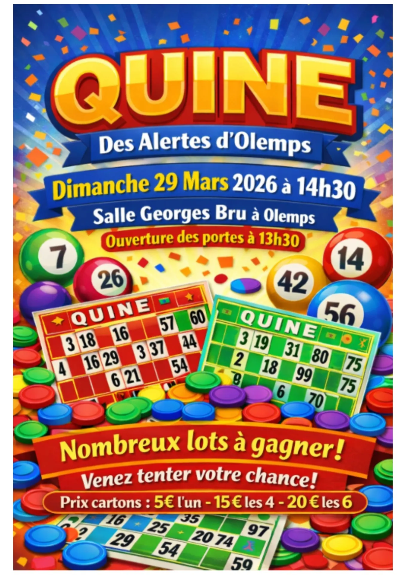 Dimanche 29 mars à 14h30 à la salle G. Bru Olemps : nombreux lots à gagner, venez tenter votre chance !