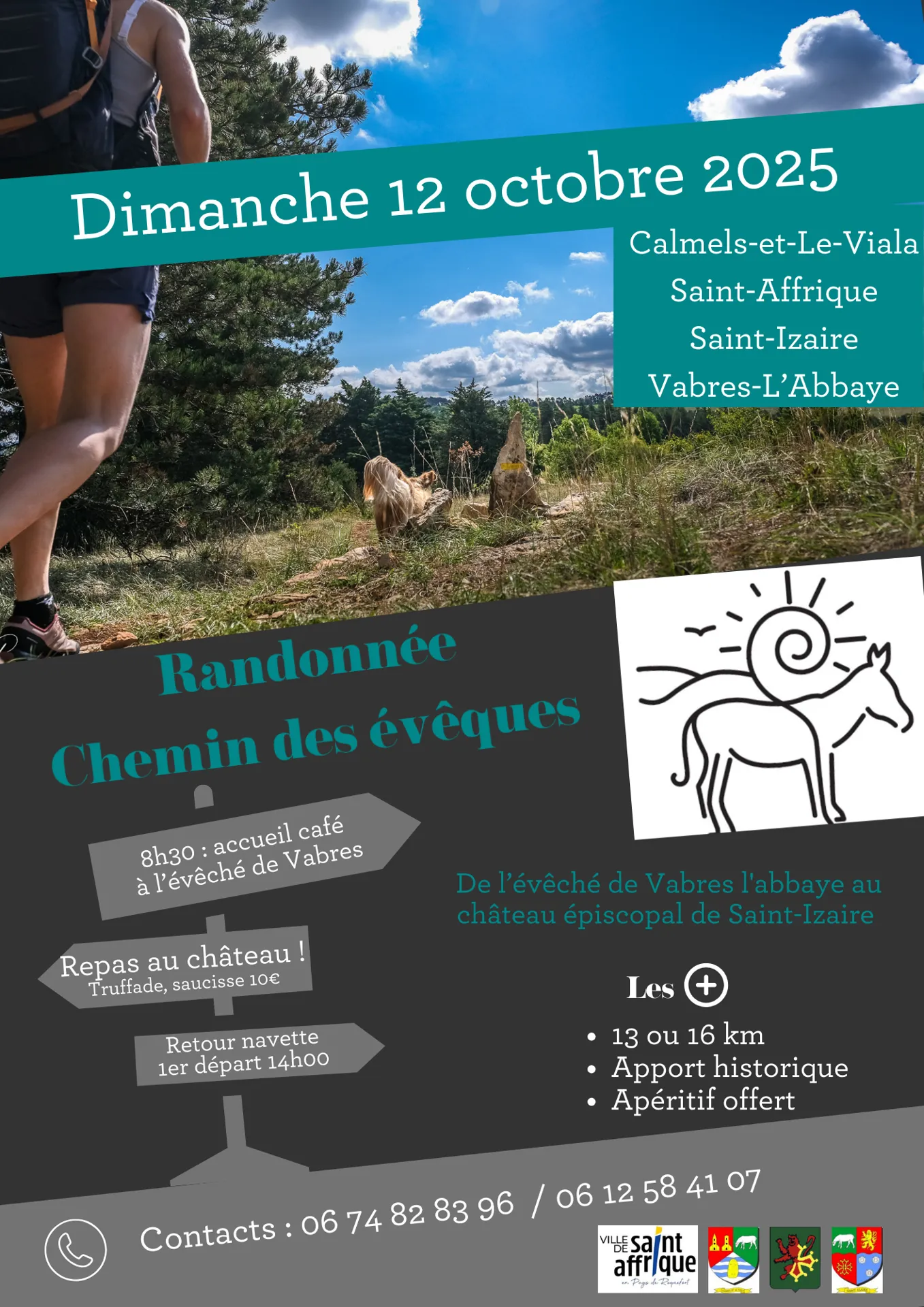 Descriptif : Cette randonnée, mêlant histoire, patrimoine et paysages d’exception, propose de cheminer sur le parcours séculaire qu'empruntaient jadis les évêques de Vabres pour se rendre au château de Saint Izaire. Les communes de Calmels et le Viala, Saint Affrique, Saint- Izaire et Vabres l’abbaye, avec l’aide des associations de randonneurs, ont réaménagé ce chemin pour qu’il devienne un chemin de randonnée permanent, conjuguant l’histoire locale, le patrimoine. Elle vous propose un parcours traversant différents territoires et des paysages superbes.