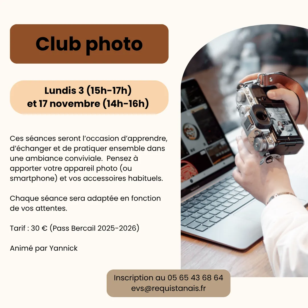 Ces séances seront l’occasion d’apprendre, d’échanger et de pratiquer ensemble dans une ambiance conviviale. Pensez à apporter votre appareil photo (ou smartphone) et vos accessoires habituels. Chaque séance sera adaptée en fonction de vos attentes.