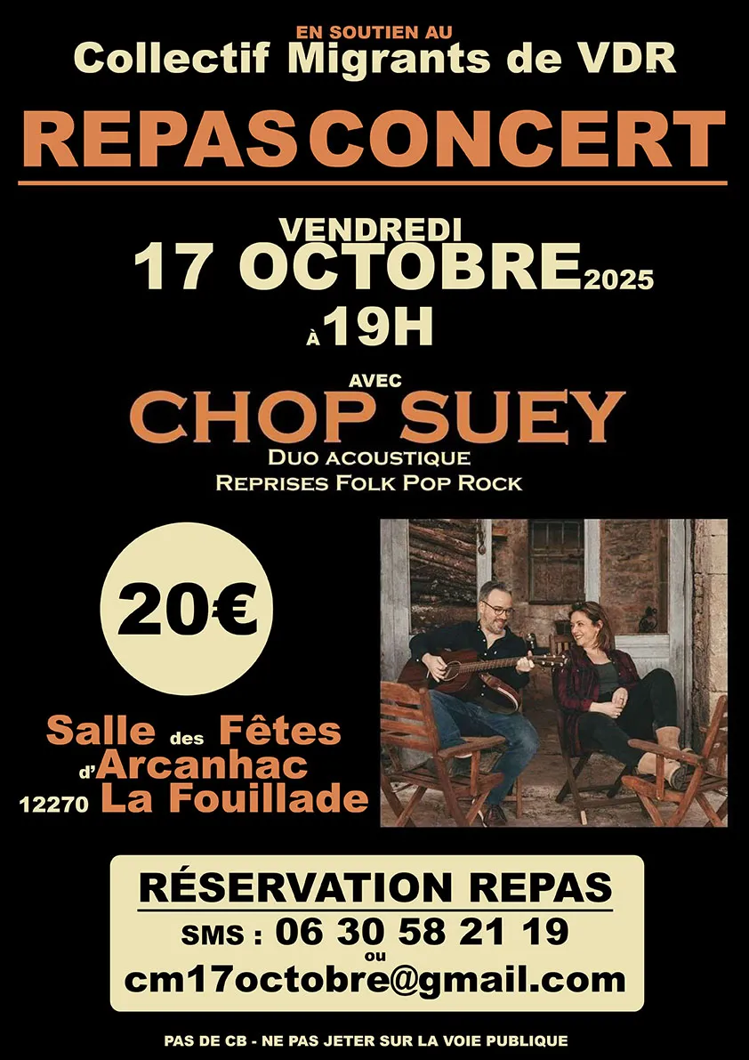 Le repas aura lieu à la salle des fêtes d’Arcanhac à partir de 19h00 - 20€.Concert de Chop Suey, duo acoustique de Denis Dutheil et Éléonore à 21h30, salle des fêtes d’Arcanhac – prix libre.