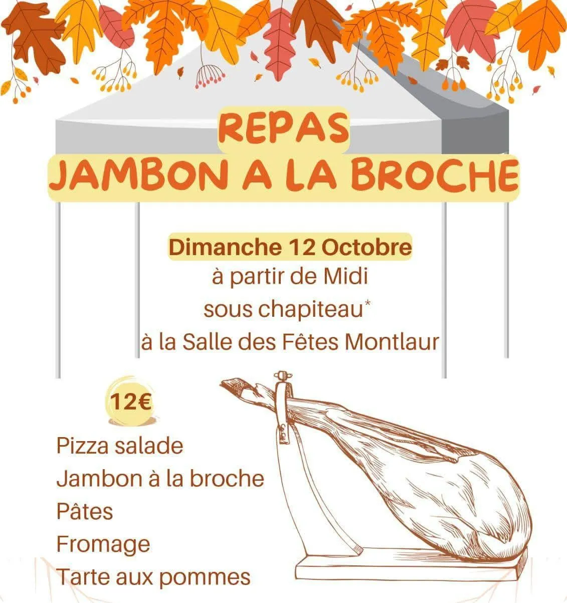 l'APE Ecole du Rougier de Montlaur vous invite à un repas "Jambon à la broche" sous chapiteau après la bourse aux jouets devant la salle des fêtes.