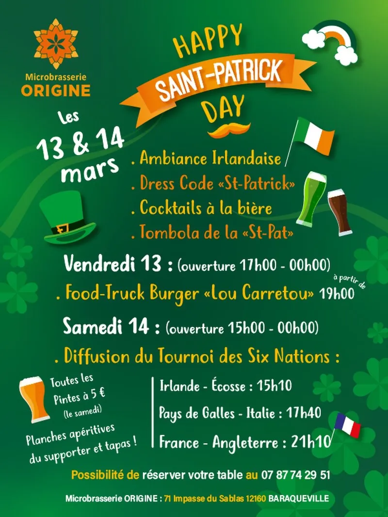 Ambiance irlandaise, dress code "St Patrick", cocktails à la bière, tombola.