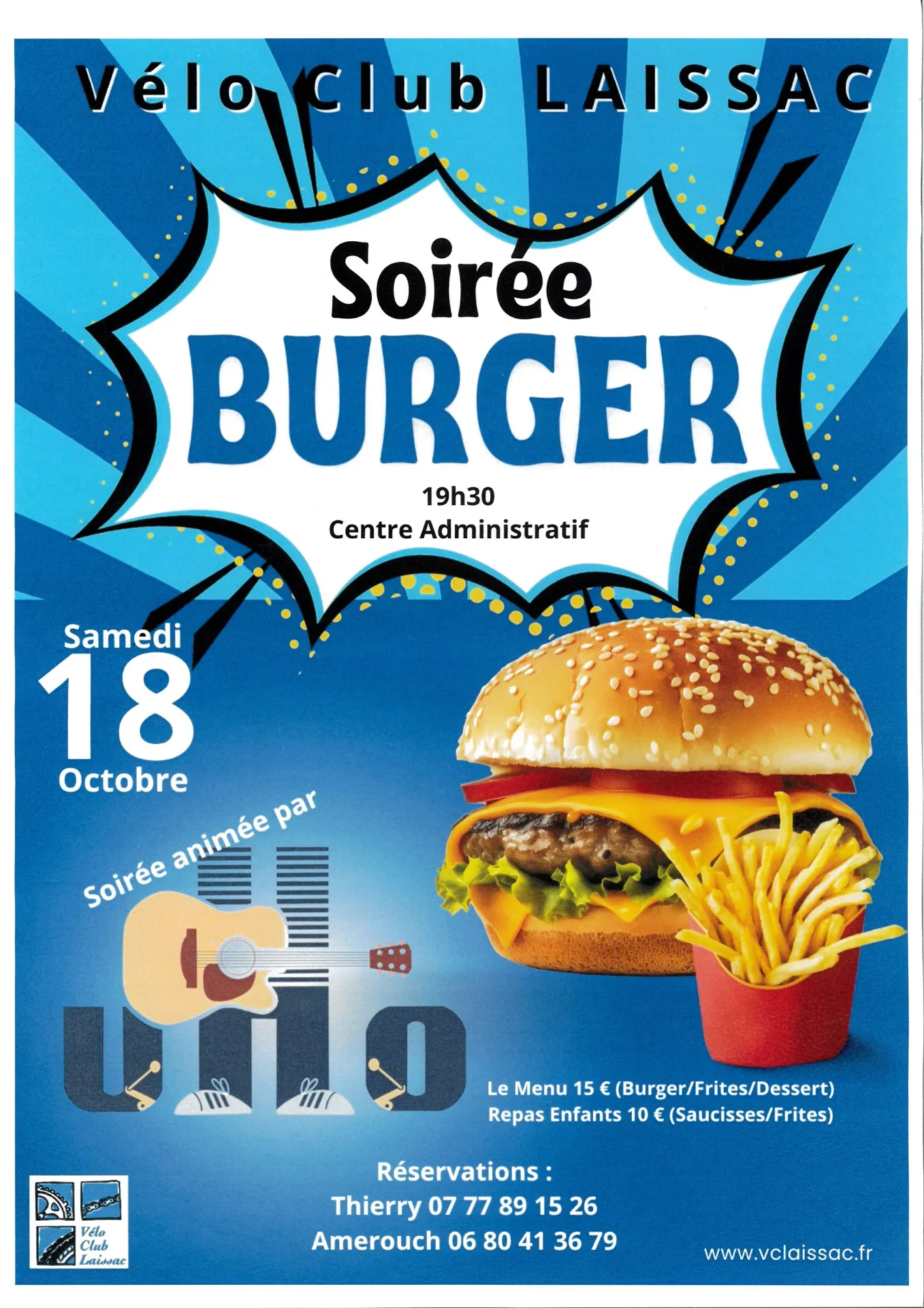 Soirée Burger du Vélo Club à partir de 19h30 au Centre Administratif de Laissac. Sur réservation. Animé par UHO.