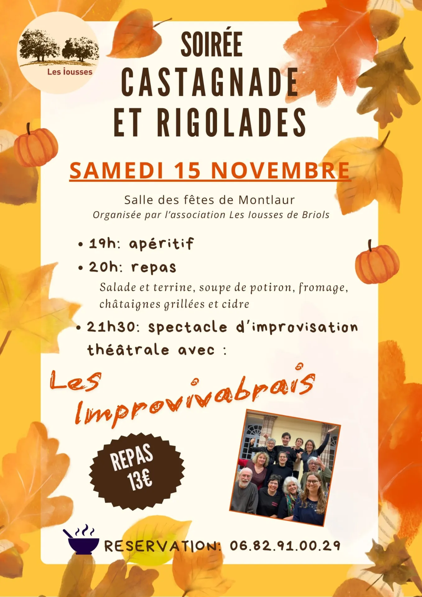 L'association les Iousses de Briols vous invite à une soirée Castagnade et Rigolades pour fêter l'automne à la salle des fêtes de Montlaur. Au programme : apéro, repas et spectacle d'improvisation