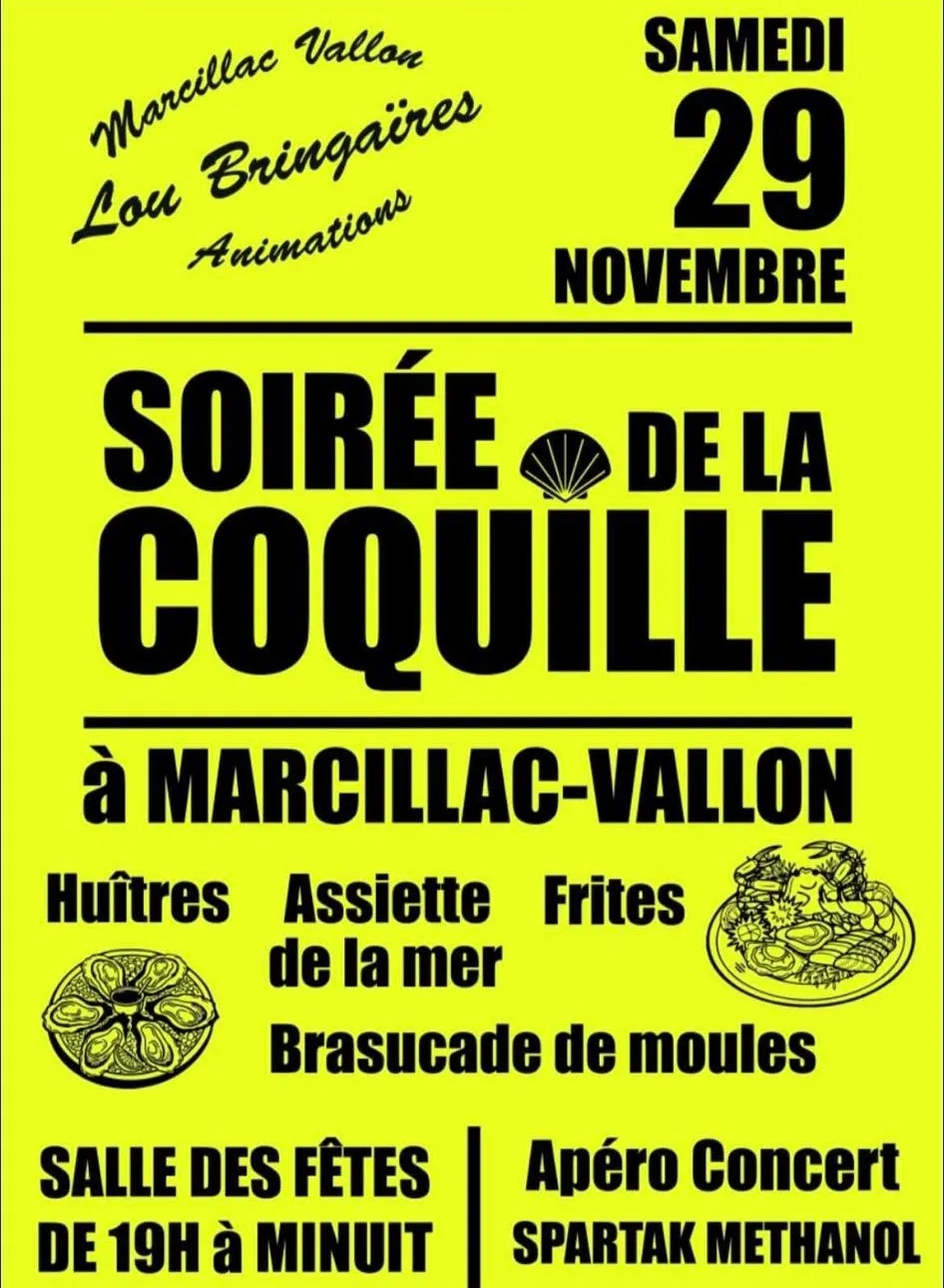 Lou Bringaïres Animations organise un repas avec animation musicale, le samedi 29 novembre de 19h à minuit, à la salle des fêtes de Marcillac.