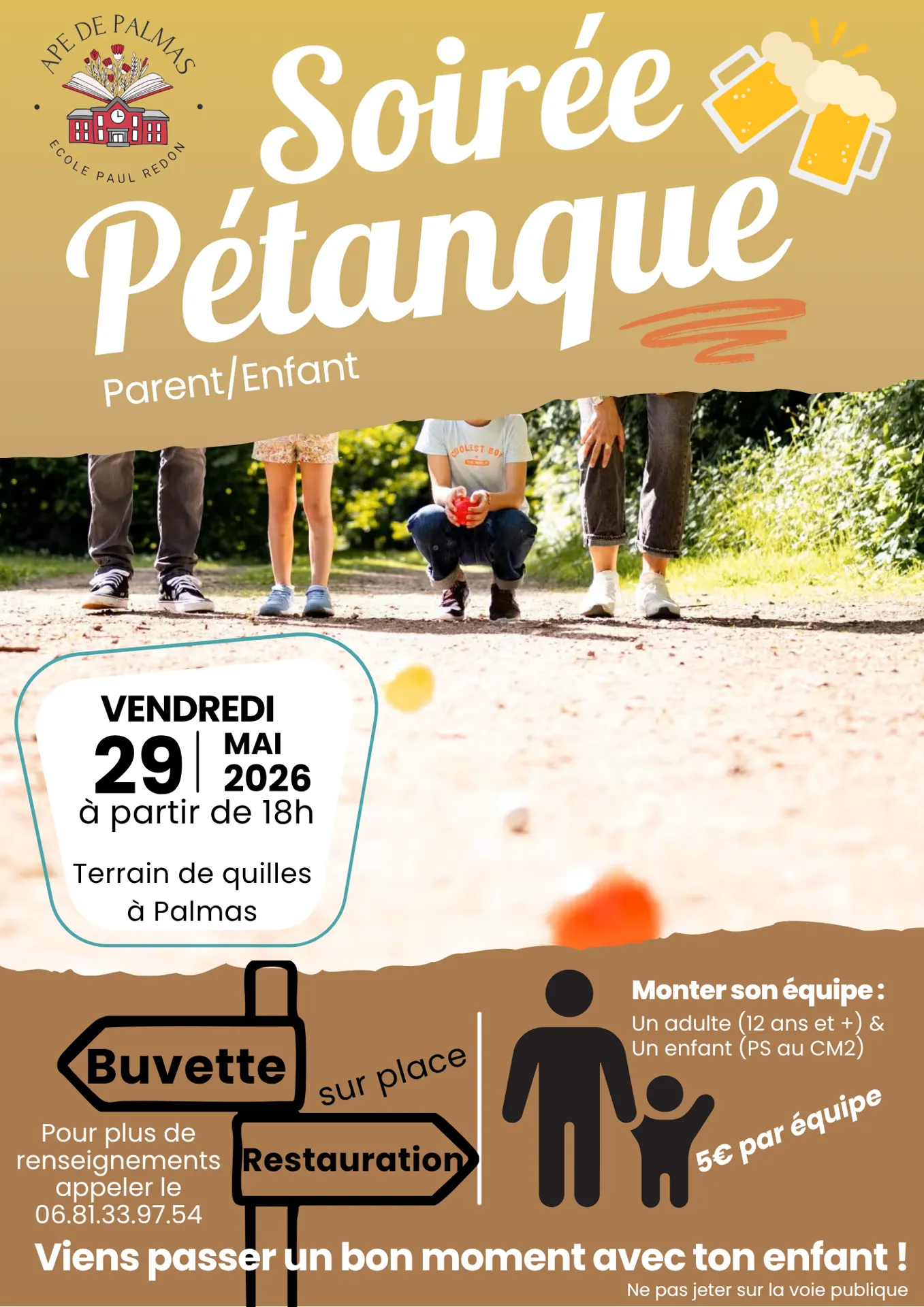 Soirée pétanque, vendredi 29 mai 2026 à partir de 18h au terrain de quilles de Palmas. Buvette et restauration sur place. Viens passer un bon moment avec ton enfant !