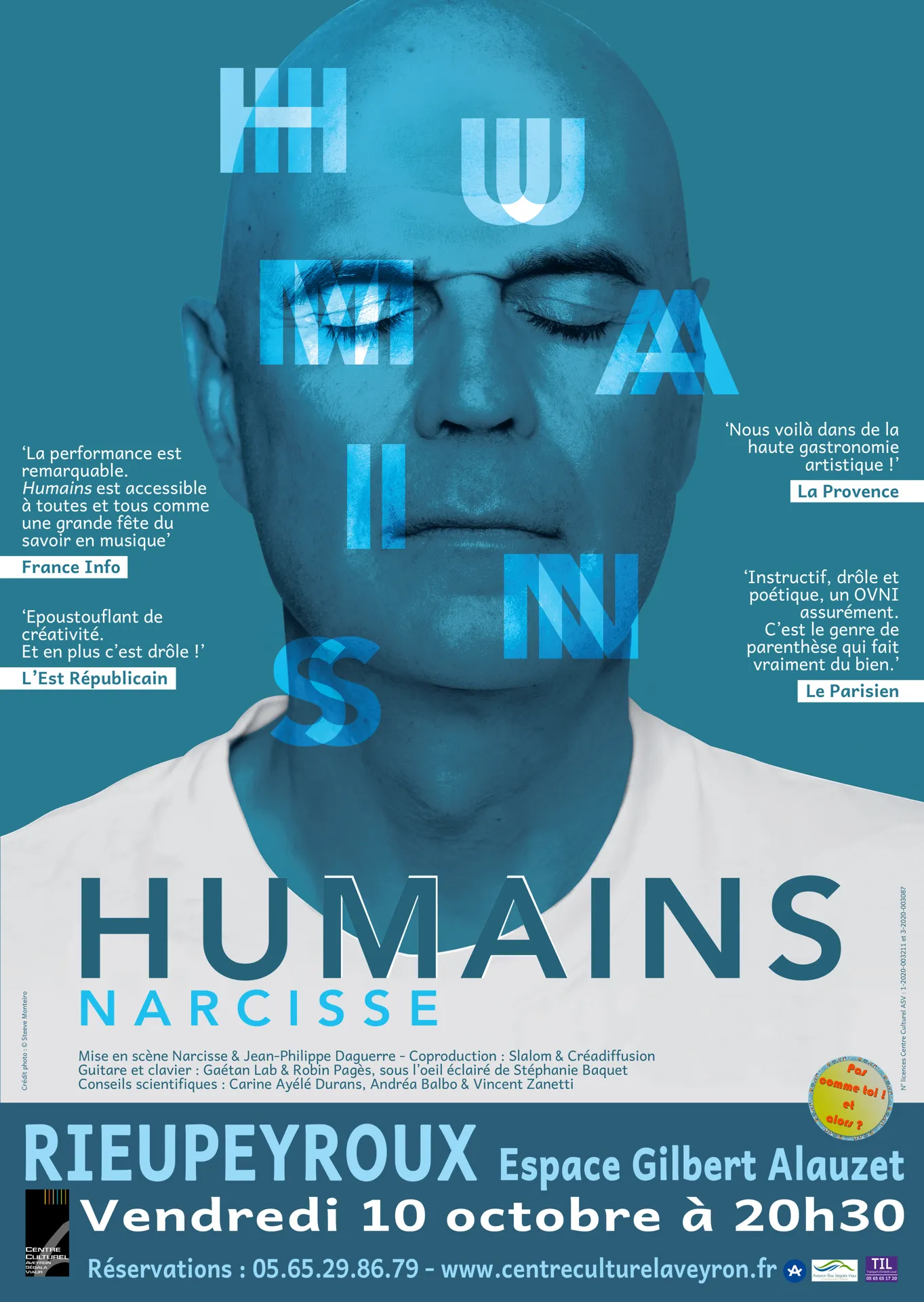 Entre conférence musico-poétique et performances enchanteresses, 'Humains' questionne, intrigue. Volant au-dessus des cimes de la réalité, Narcisse butine en toute liberté partout où fleurit la beauté.