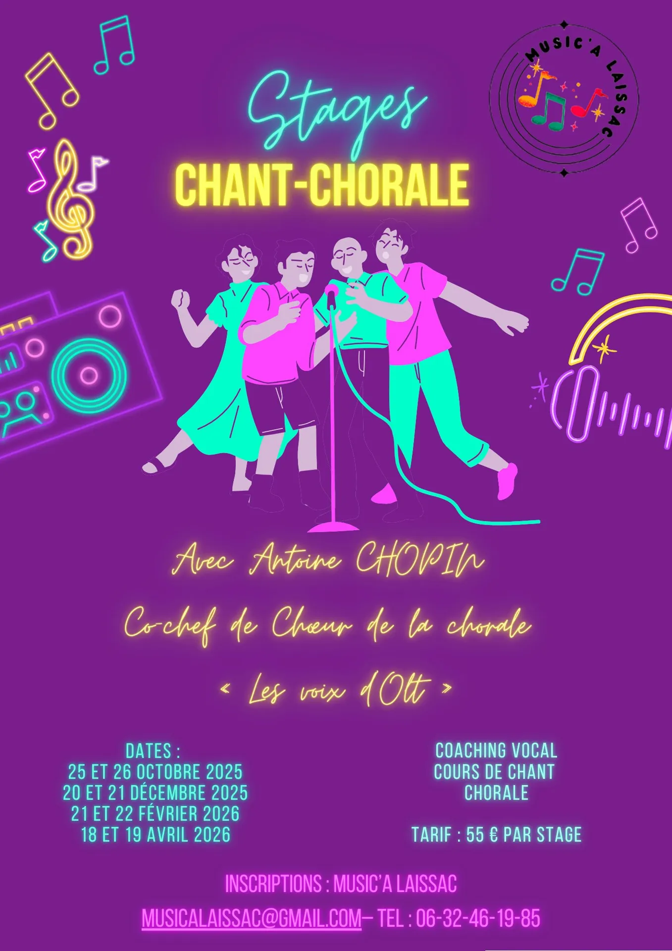 Stage de chant chorale avec Antoine CHOPIN co-chef de chœur de la chorale "les Voix d'Olt". Au programme : Chorale, coaching vocal, et gestion du stress, cours de chant.