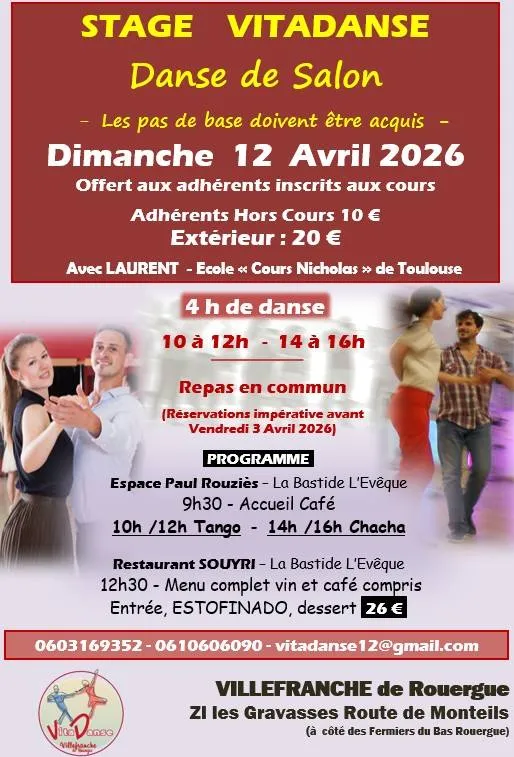 Avec Laurent :10h /12h Tango - 14h /16h ChaChaOffert par l’association aux adhérents de nos cours.Ouvert aux danseurs non adhérents.Repas en commun possible au Restaurant Souyri sur réservation impérative avant le 3 Avril.
