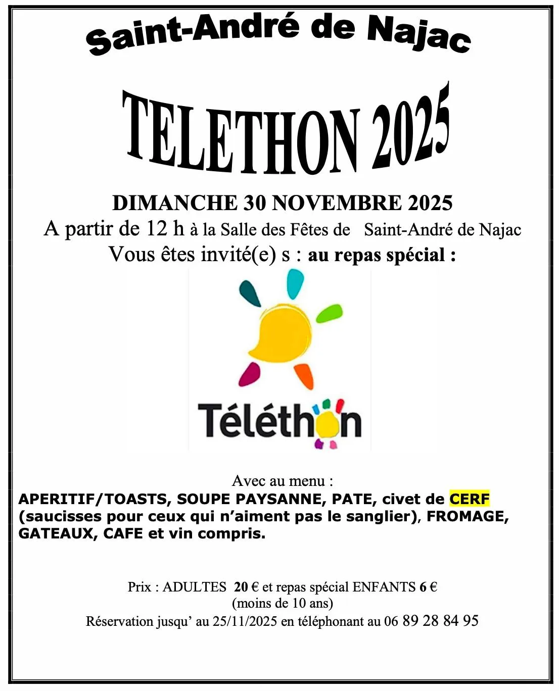 A partir de 12h à la salle des fêtes de Saint-André de Najac vous êtes invité(e)s au repas spécial Téléthon.