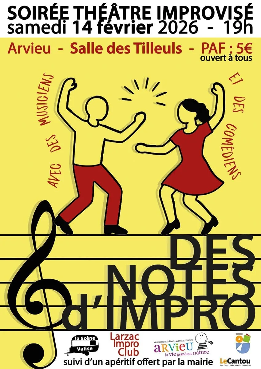 19h - Salle des Tilleuls. Soirée théâtre d'impro "Des notes d' impro" par le Larzac Impro Club. Venez profiter de toute l'énergie de ces comédiens et musiciens ! Tout public. Entrée: 5 € / moins de 18 ans: gratuit.