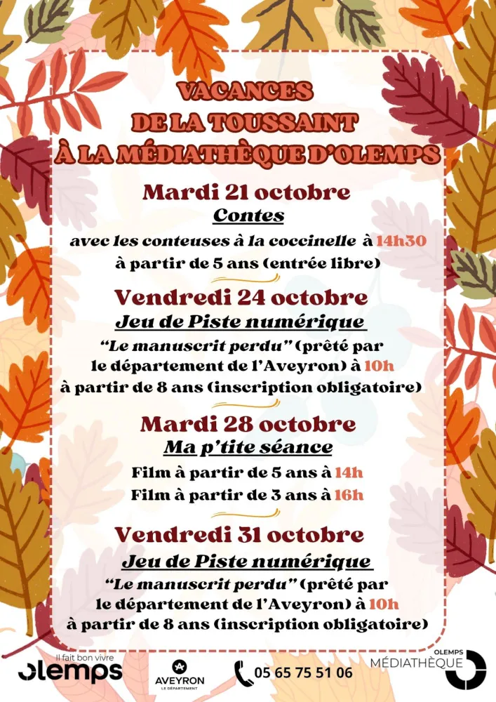 Vendredi 24 octobreJeu de Piste numérique“Le manuscrit perdu”à 10h à partir de 8 ans(inscription obligatoire)Mardi 28 octobreMa p’tite séanceFilm à partir de 5 ans à 14hFilm à partir de 3 ans à 16hVendredi 31 octobreJeu de Piste numérique“Le manuscrit perdu”à 10h à partir de 8 ans(inscription obligatoire)