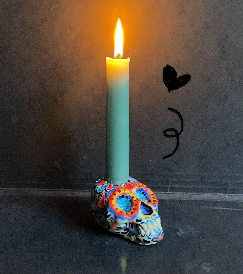 Réalisez un bougeoir en forme de crâne dans de l’argile autodurcissante. Vous le mettrez ensuite aux couleurs d’Halloween avec de l’acrylique, des plumes et des paillettes.