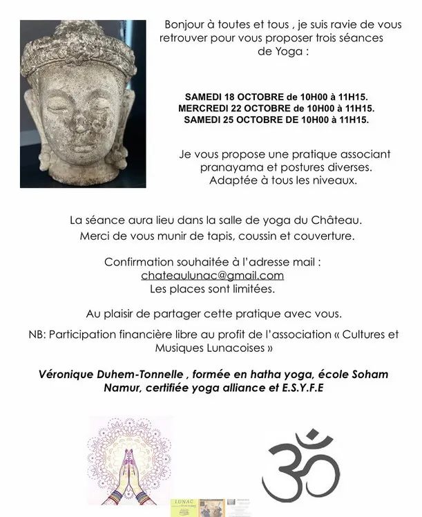 Véronique Duhem-Tonnelle, formée en hatha yoga, école Soham Namur, certifiée yoga alliance et E.S.Y.F.E vous propose une pratique associant pranayama et postures diverses. Adaptée à tous les niveaux.La séance aura lieu dans la salle de yoga du Château. Merci de vous munir de tapis, coussin et couverture.