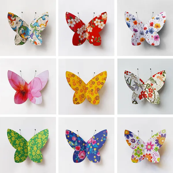Magnets artisanaux faits de papiers colorés et d'antennes aimantées.