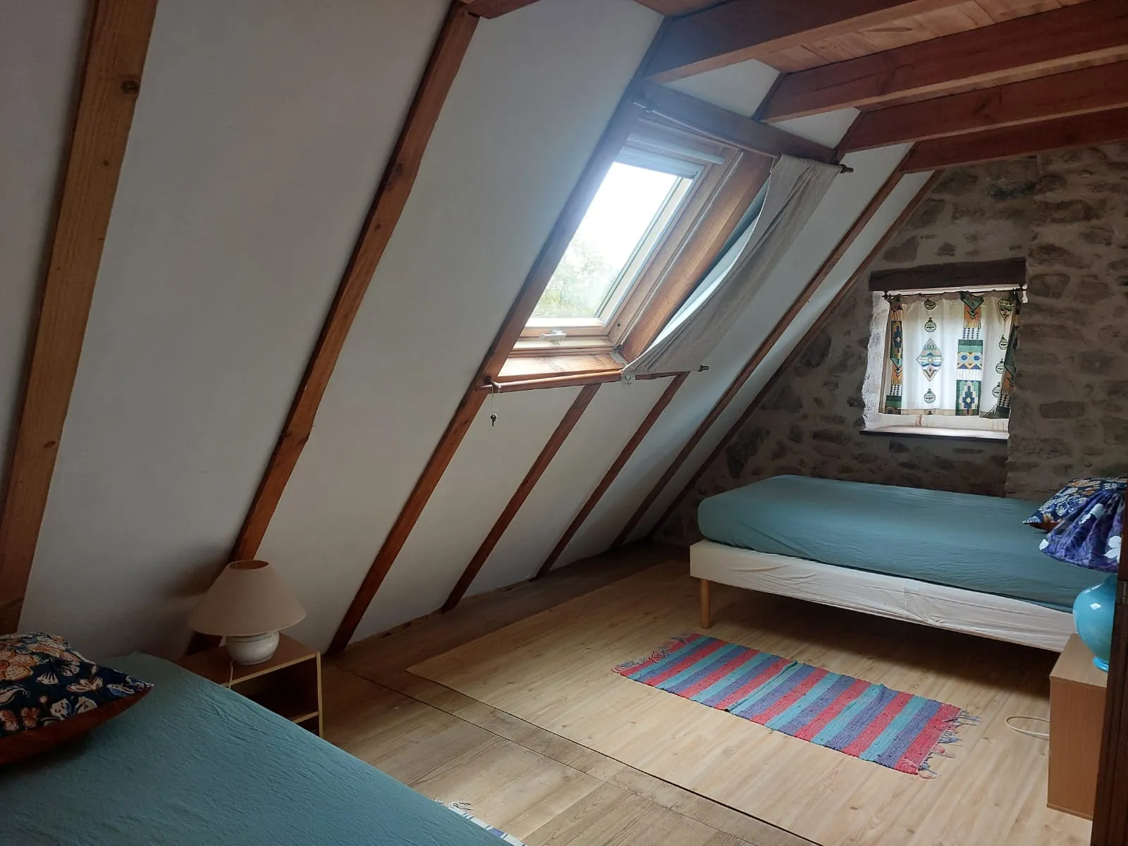 En dortoir, nous avons deux chambres avec deux lits simples chacune ainsi qu'une salle de bain partagée.A côté, nous avons un chalet équipé de deux pièces pouvant recevoir jusqu'à quatre personnes avec jardin privatif, poêle à bois, coin cuisine etc...
