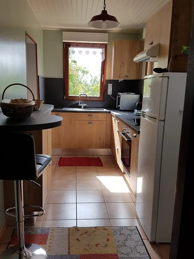 Séjour attenant à la cuisine équipée (lave-vaisselle, plaque induction, four micro-ondes, TV) - 1 chambre (lit 160) - 1 chambre (2 lits 90) - 1 espace détente (canapé lit 140) - Salle d'eau - WC - Lave-linge, chauffage central et insert bois également.