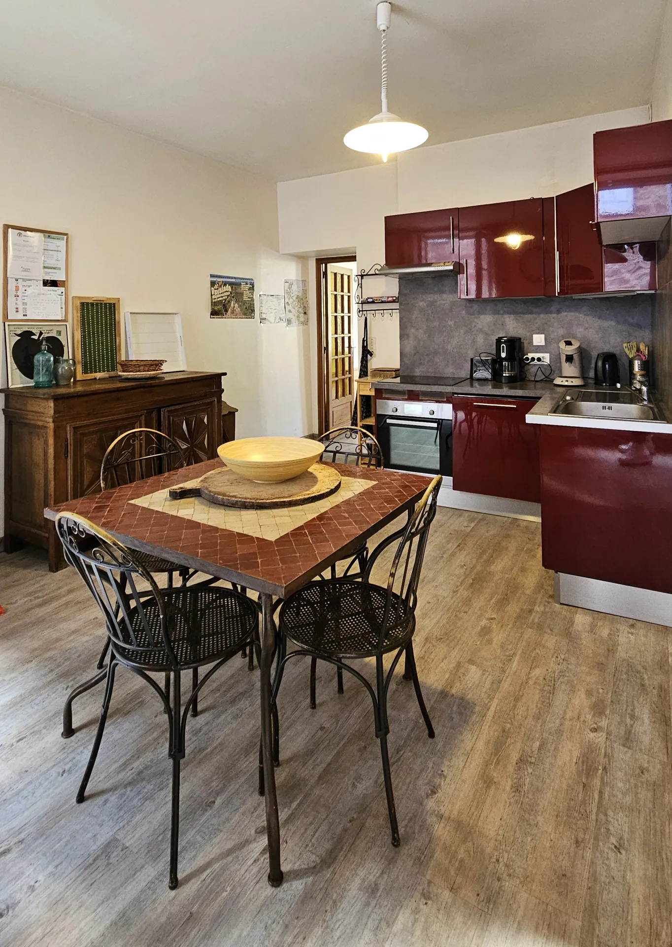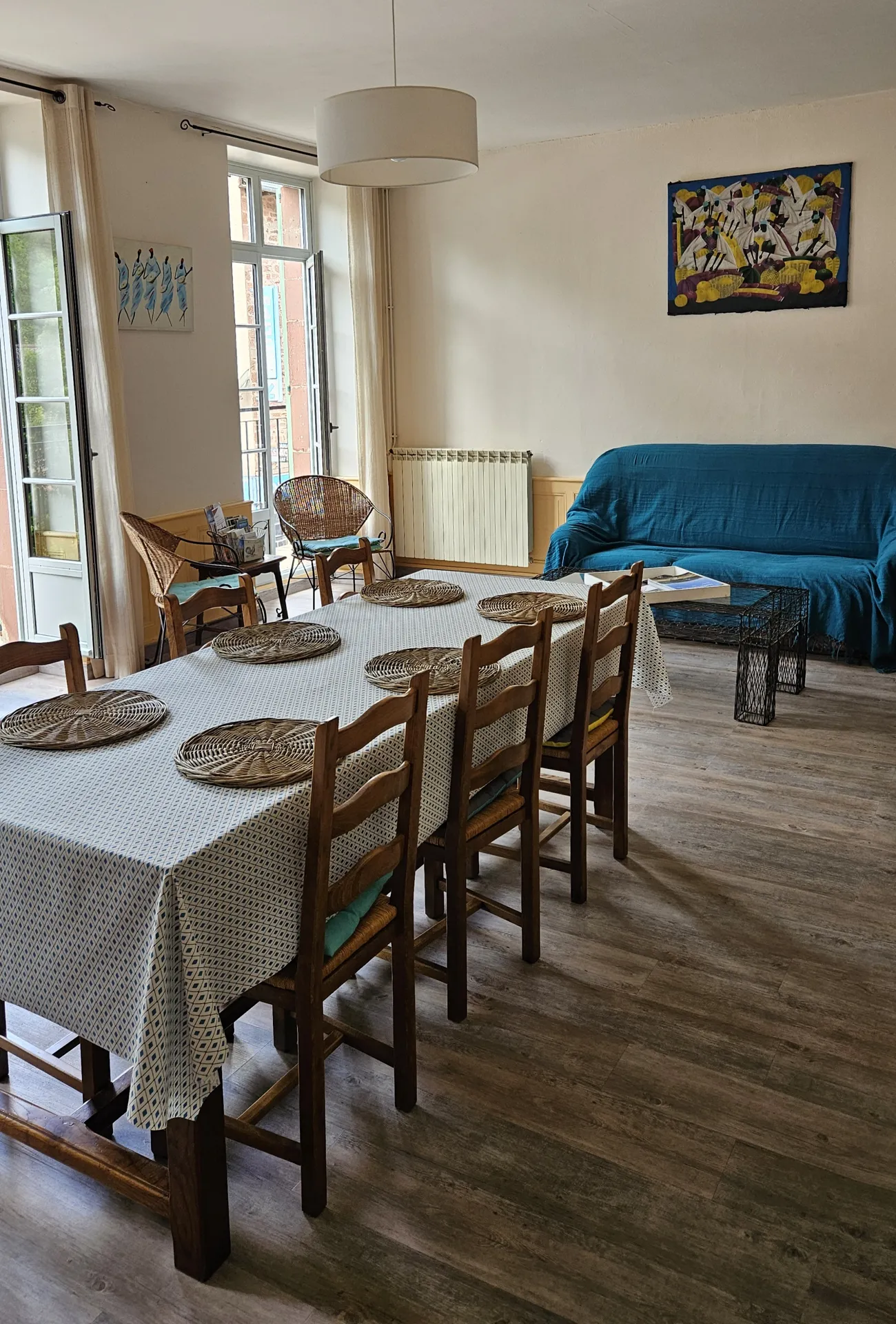 Maison de village de caractère, sur rue principale. Village médiéval classé.Cuisine américaine, séjour ensoleillé avec balcon, convertible.4 chambres (9 personnes) + bébé, 2 salles de bain, 3 WC dont 2 indépendants.Garage.