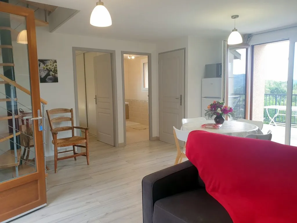- Séjour (canapé, petit bureau, télévision écran plat, wifi) ouvert sur une cuisine entièrement équipée (plaques inductions, micro-ondes, four, lave-vaisselle, cafetière filtre et Senseo, bouilloire, grille-pain....). Le séjour s'ouvre également sur une terrasse en bois dominant la vallée où sont installés transats et salon de jardin.