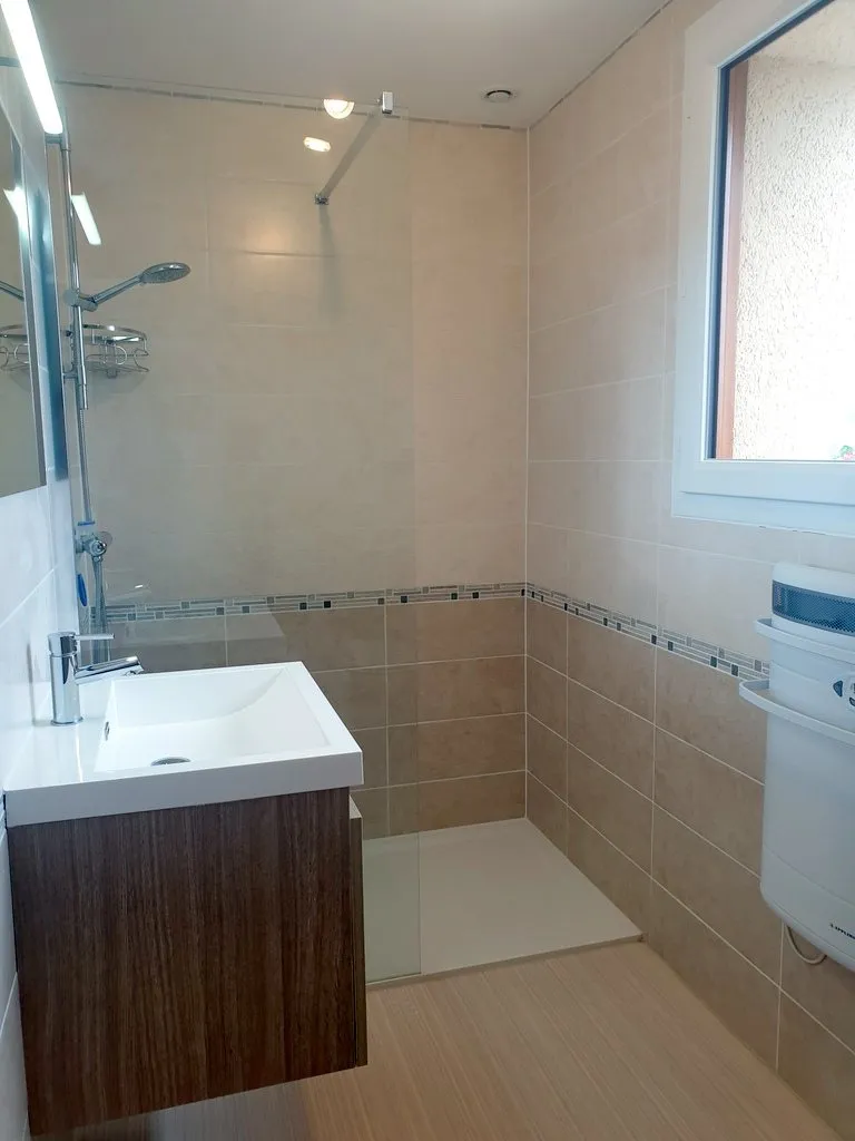 - Salle d'eau avec une douche à l'italienne et un meuble vasque. Les wc sont non séparés.