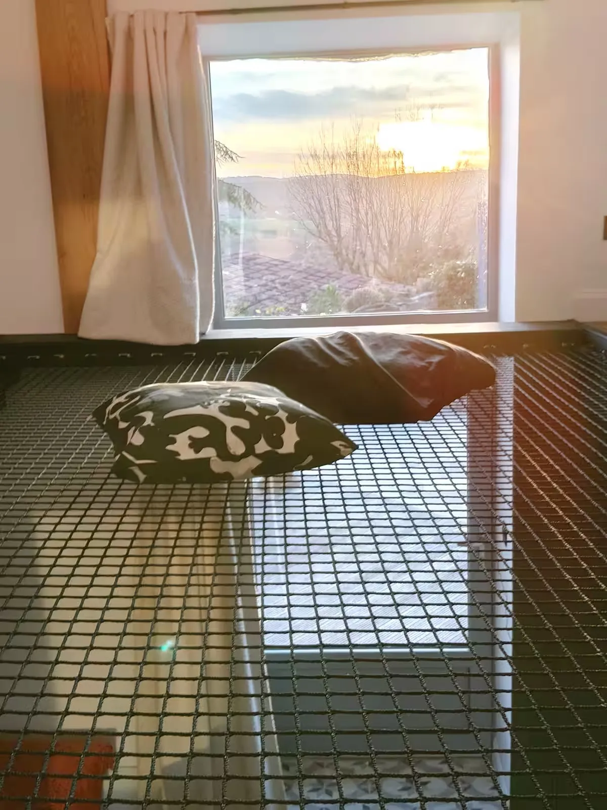 Coin détente insolite : un filet catamaran suspendu à l’étage, au-dessus du salon, qui ravira petits et grands !