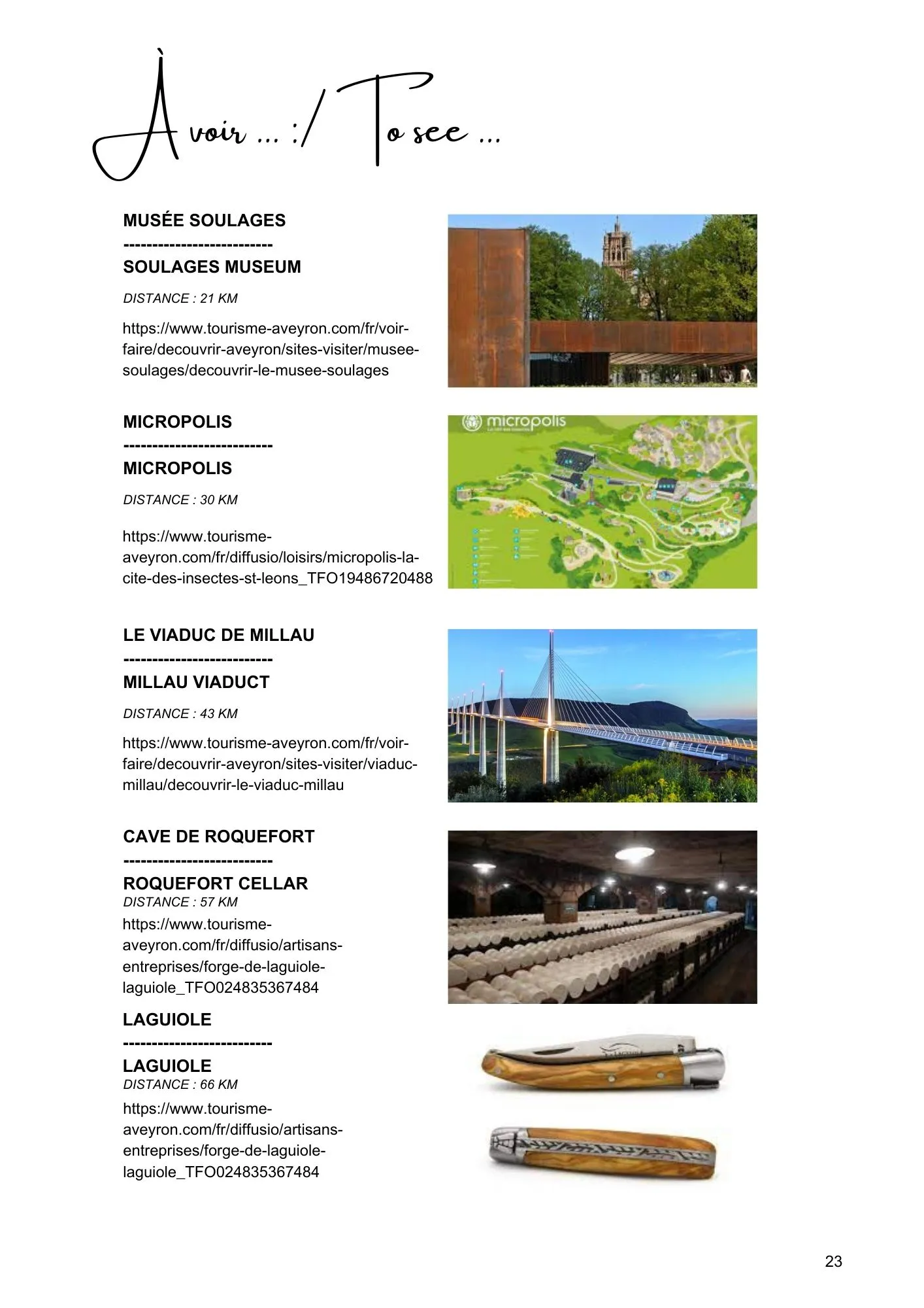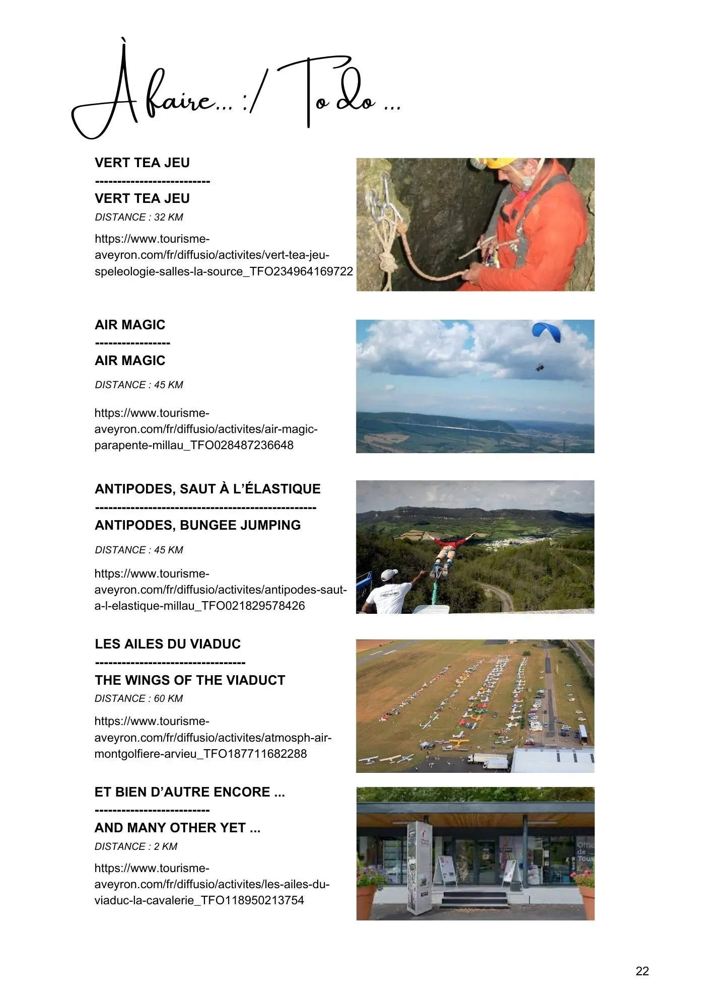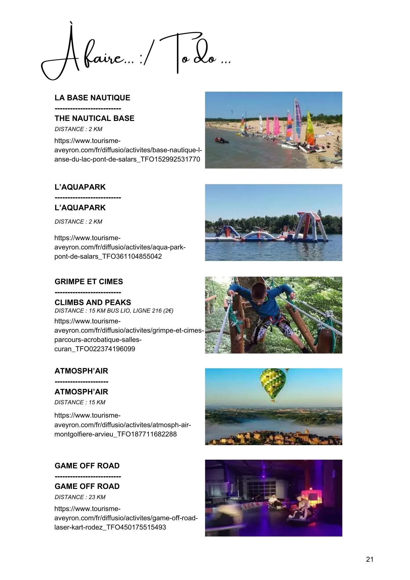 Les activités aux alentours sont multiples :- Au lac de Pont de Salars:--- La base nautique vous propose la location de canoës, kayaks et de pédalos, stand up paddle à la plage. Encadrement voile et dragon boat, canoë, kayak sur demande.--- l'Aqua-park vous propose l'aqua-ludique sur des structures gonflables. Baignade, sauts, glissades et parcours aquatiques dès 7 ans. Location à l'heure ou à la demi-journée.- Au lac de Pareloup à Salles-Curan, pour vous y rendre, vous pouvez prendre le bus, l'arrêt se trouve à 2 minutes du Gite à pied, ligne 216 (2€/pers fait en 15 min), vous pouvez faire de l'accrobranche à Grimpe et cimes.Un paddle peut être mis à disposition sur demande.- Sur Arvieu, 20 min en voiture, un rêve d'enfant… devenez passager du vent !!! A la découverte des Monts et Lacs du Lévézou vus du ciel au balcon d'Atmosph'Air montgolfières occitanes. - A Le Monastère , à 18 min en voiture, venez explorer le monde souterrain ! - Sur Rodez, toujours la ligne 216 (25 min), prenez les commandes de ce Kart complétement fou et pilotez façon Mario Kart. Découvrez le Frisson Ultime du Laser Kart aux Portes de Rodez chez Game Off Road !- Sur Millau, à 40 min en voiture :--- Découvrez le parapente à Millau lors d'un baptême de l'air en vol biplace, avec un moniteur breveté d'Etat passionné de vol libre, pour une expérience inoubliable ! --- Le saut à l'élastique ! --- Les Ailes du Viaduc en ULM.Et tant d'autre : - Musée Soulages- Caves de Roquefort - Laguiole - Micropolis