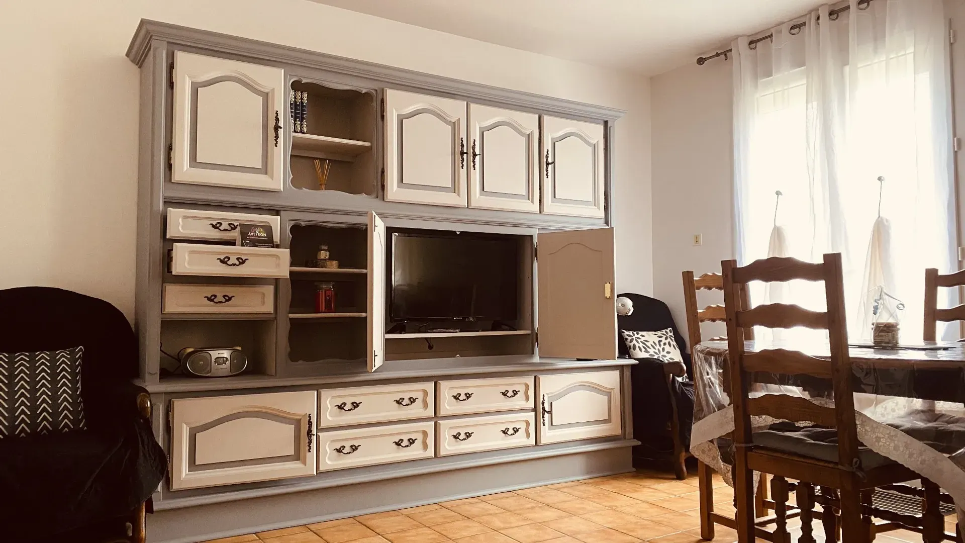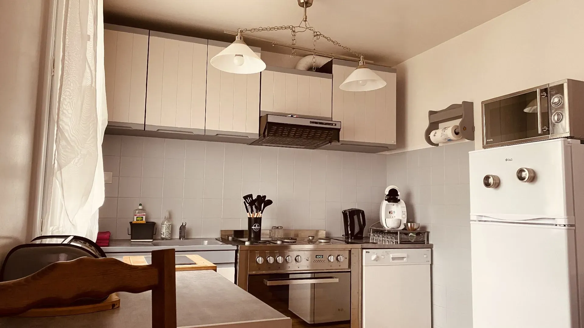 Le salon, la salle à manger et la cuisine sont tout équipés, appareils de cuisson, frigo avec partie congélateur, lave-vaisselle, machine à café, four, télé.