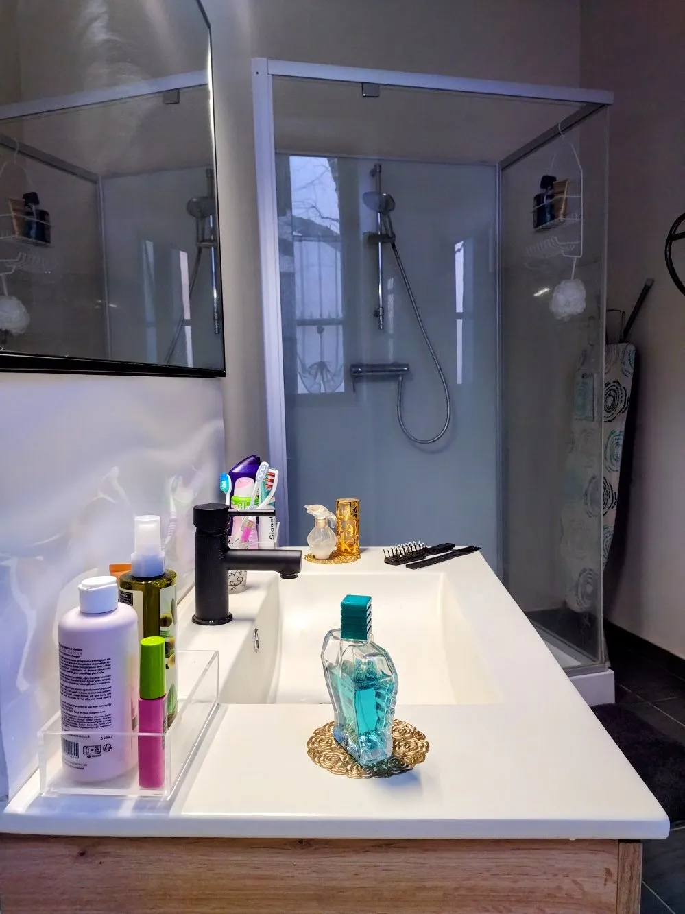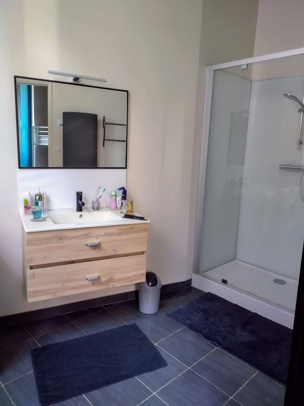 La salle de bain comprend une cabine de douche spacieuse (120x80), un lave-linge et des WC séparés.