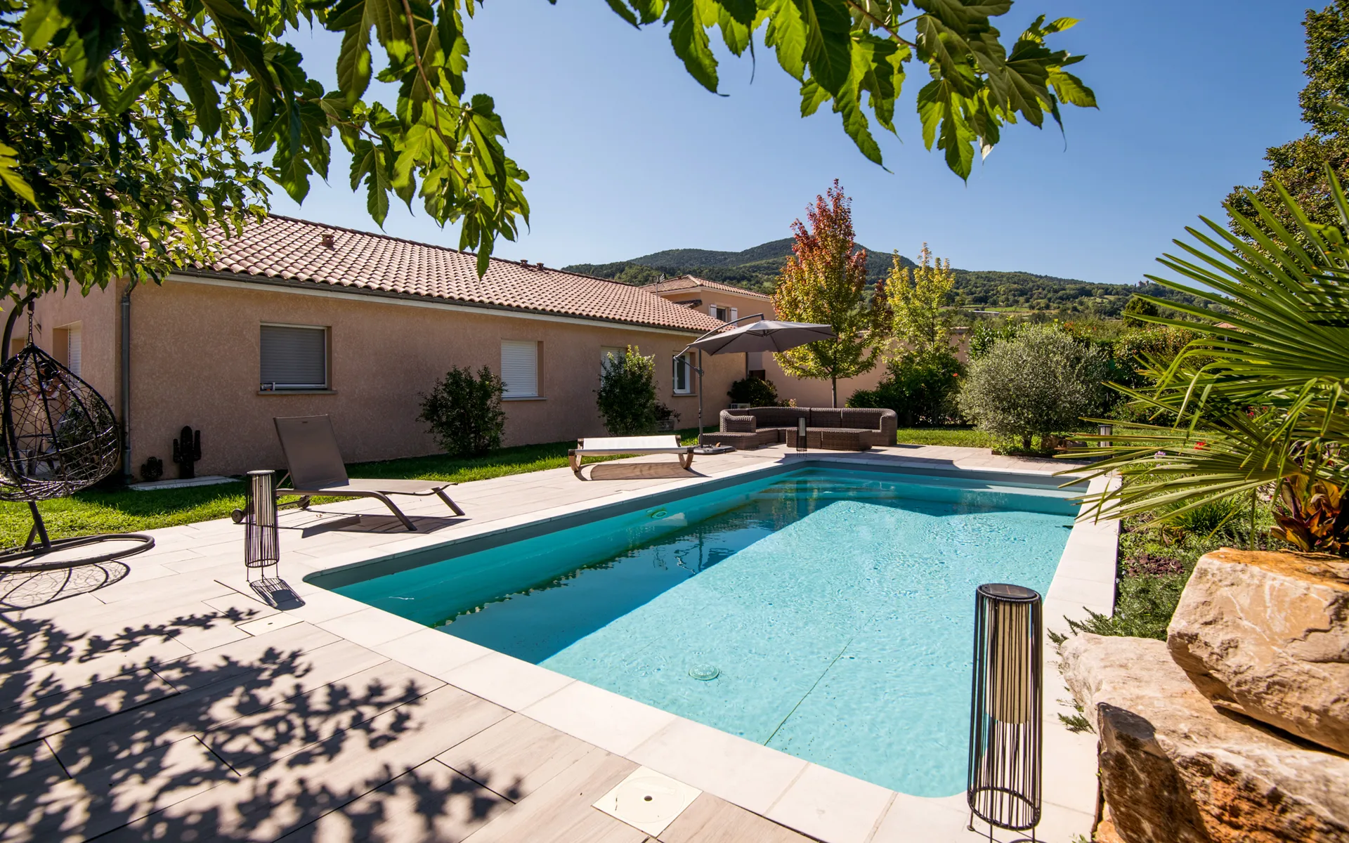 À l’extérieur, profitez d’un jardin arboré, d’une piscine privée avec transats, d’une terrasse idéale pour les repas en plein air, ainsi que d’une dépendance.