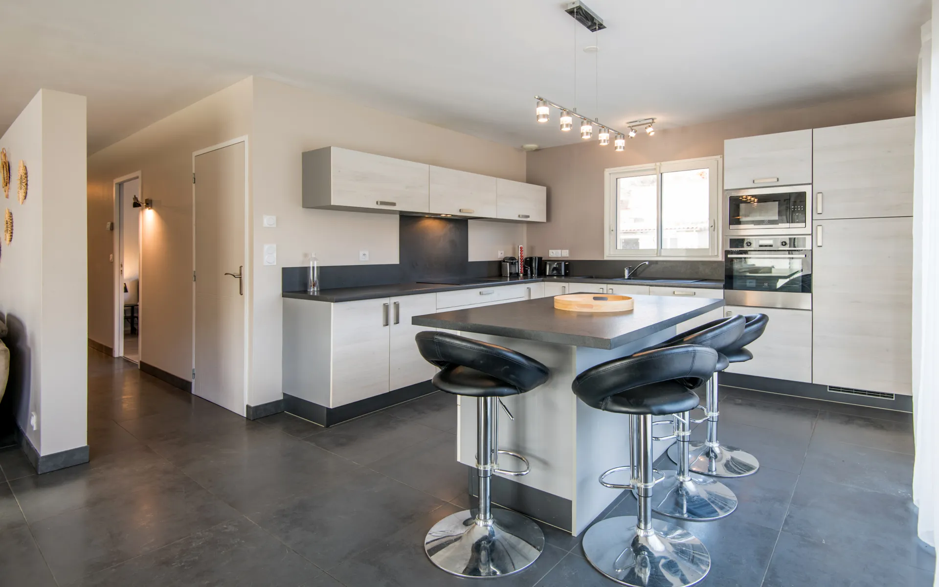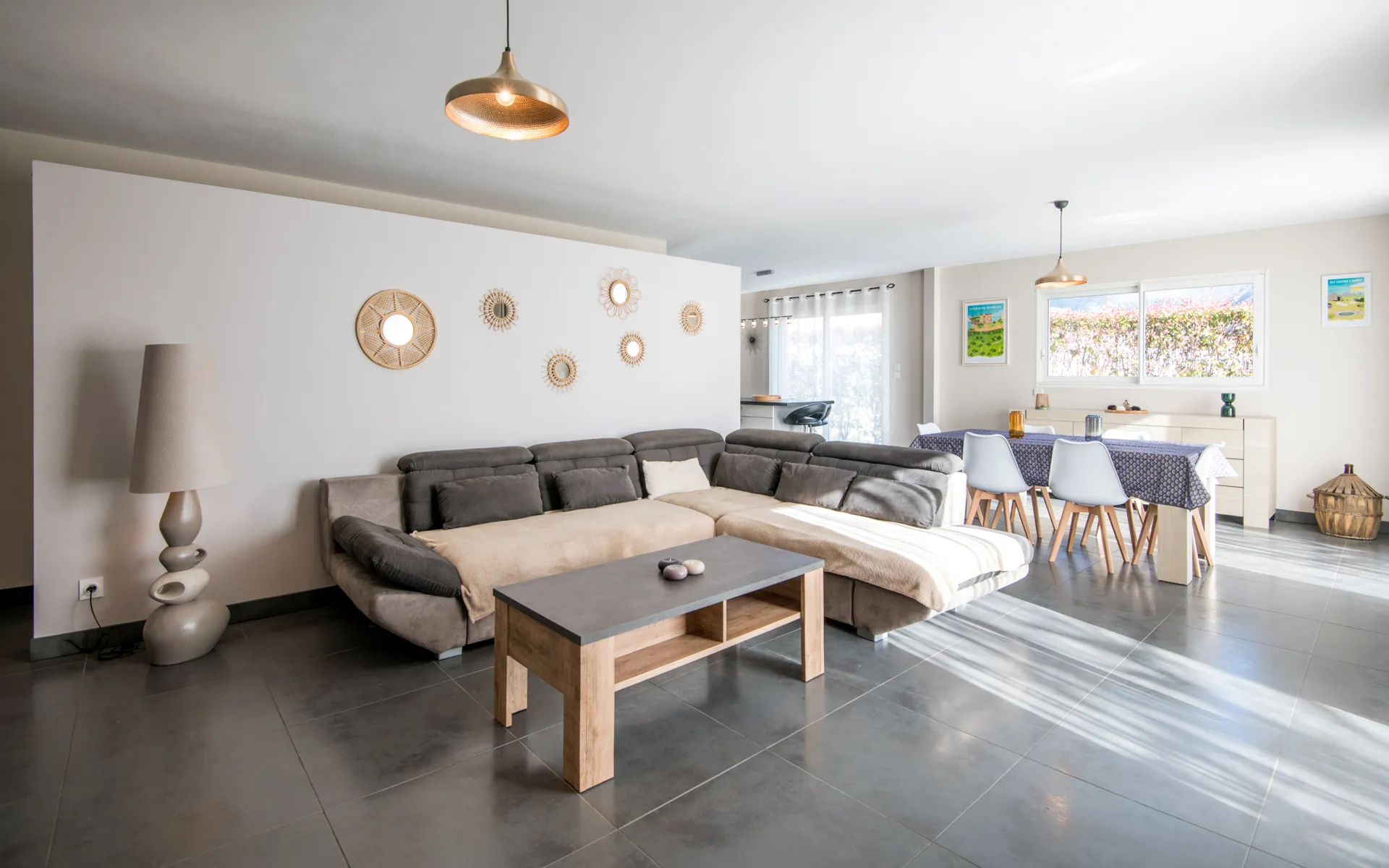 La maison dispose d’une grande pièce de vie lumineuse avec salon confortable, espace repas et larges baies vitrées ouvrant sur le jardin. L’ambiance est moderne, chaleureuse et propice à la détente.