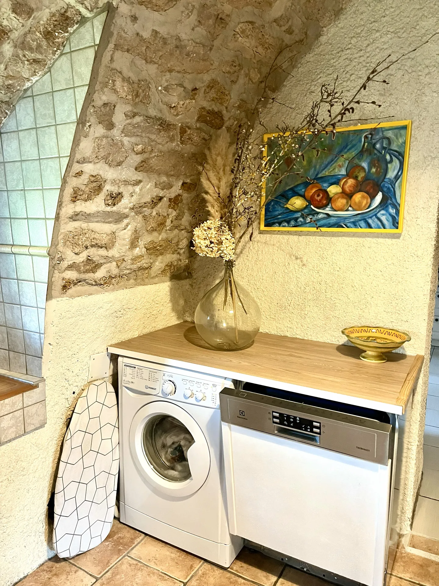La cuisine est équipée : réfrigérateur, micro-ondes, congélateur, lave-vaisselle, four, bouilloire et cafetière à filtres, grille-pain.