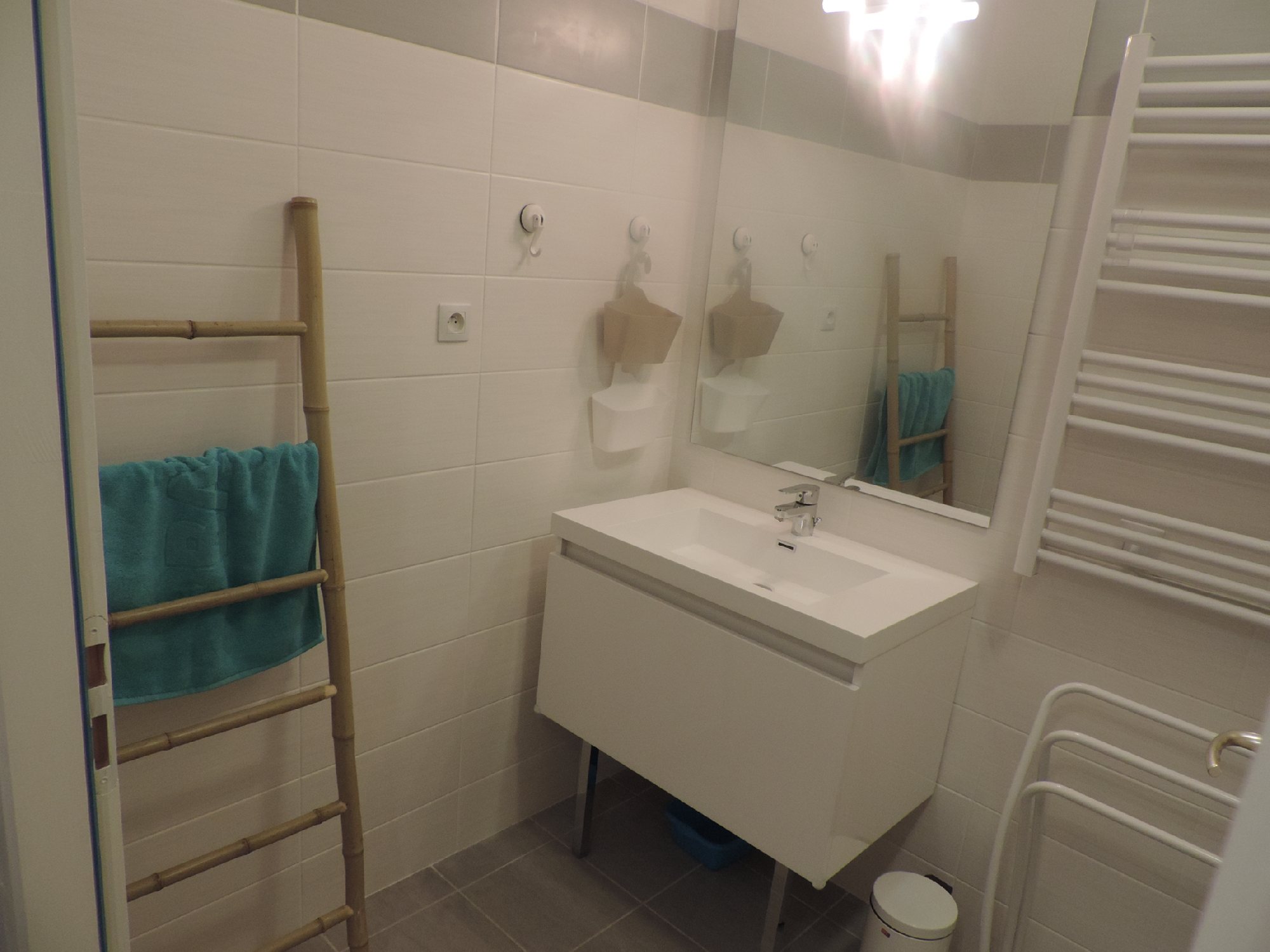 - Salle d'eau avec douche, lavabo, sèche serviettes et étagères pour rangement.
