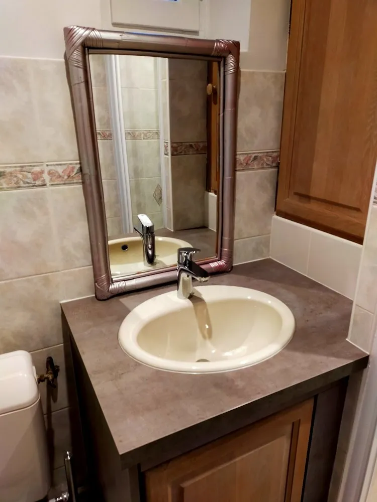 - 1 salle d'eau avec porte pare-douche, meuble sous vasque et wc, sèche cheveux