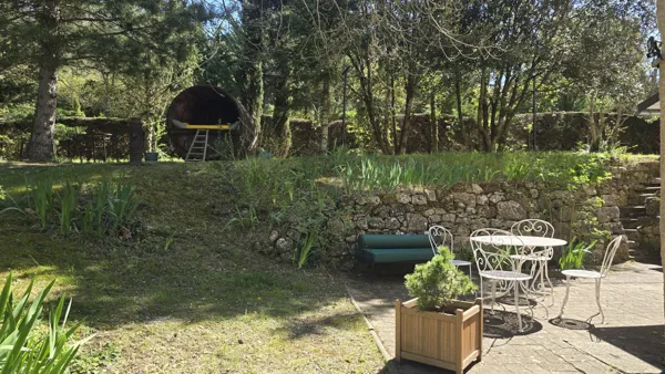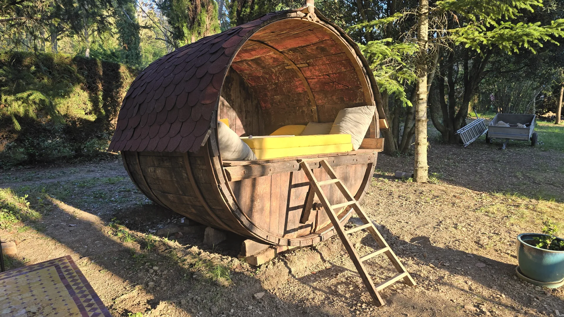 Pour une expérience atypique et unique, mise à disposition d'un ancien foudre (barrique de vin de 2X2 m) aménagé en coin sieste ou cabane pour les enfants.