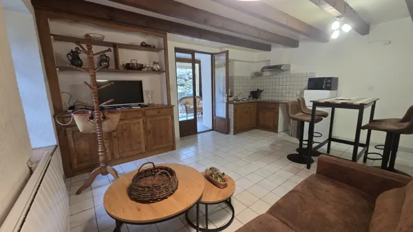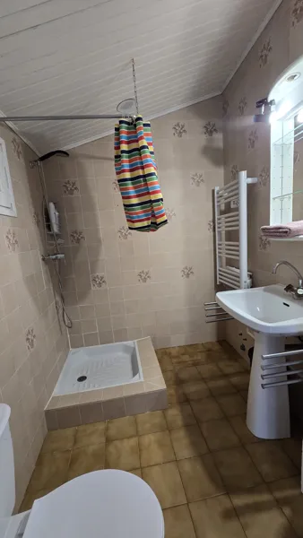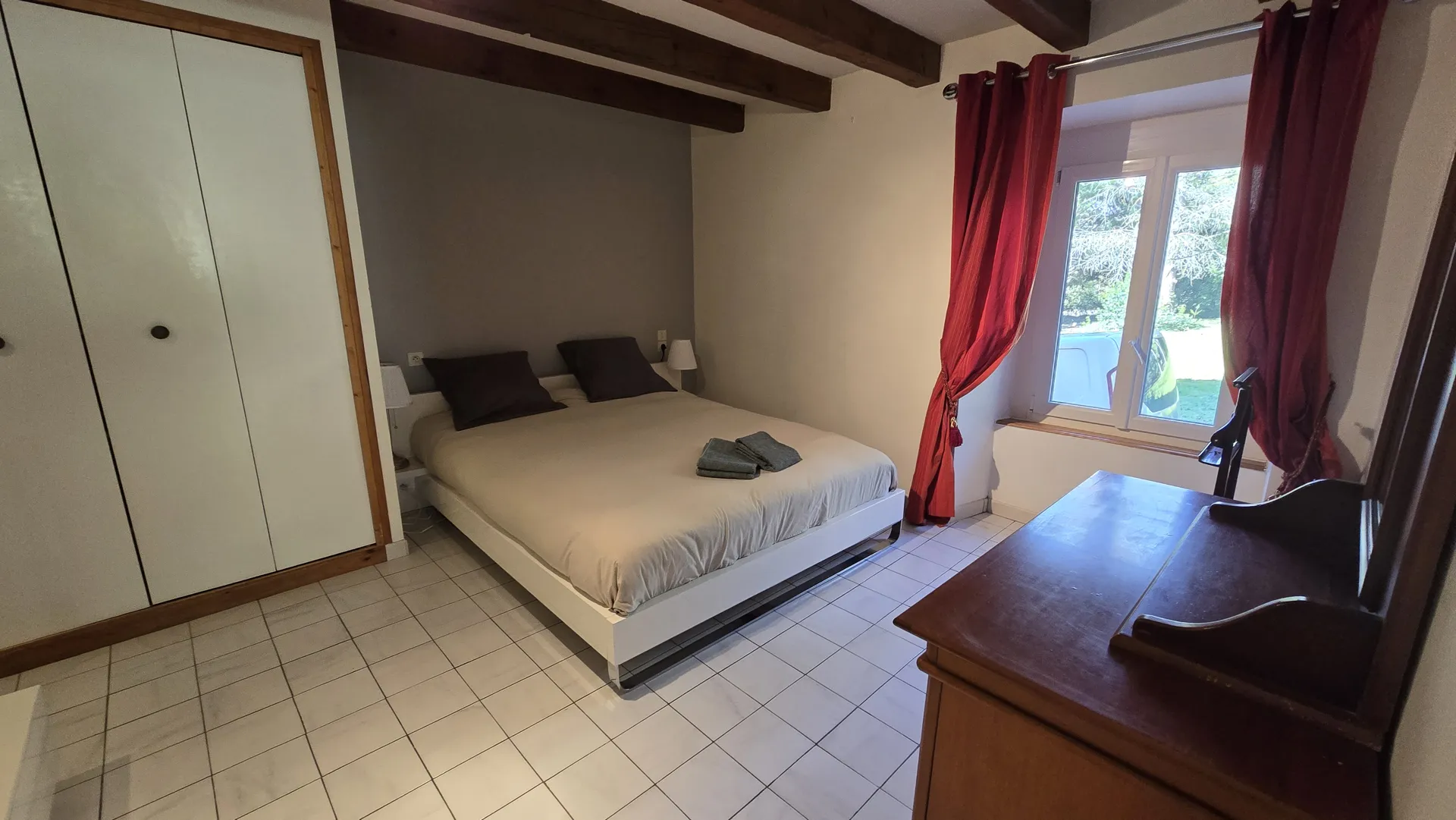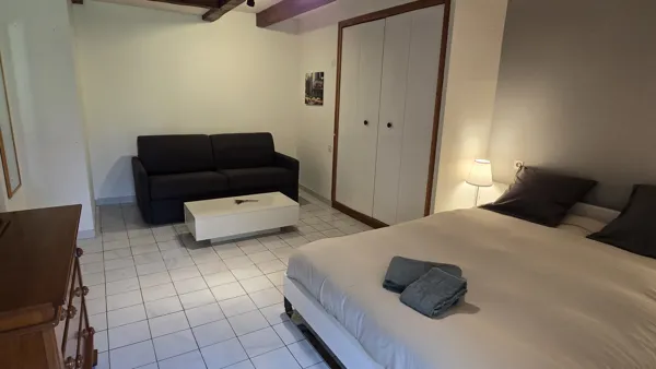 Logement au RdC, de plein pied, constitué d'une grande chambre comprenant un lit en 160 et un canapé convertible 2 places avec vrai matelas, d'un salon/cuisine également équipé d'un canapé convertible 2 places avec vrai matelas, d'une véranda, d'une salle de bain et d'un espace extérieur avec table, transat, barbecue à gaz et local à vélos. Accès et parking privé mis à votre disposition dans la propriété.